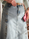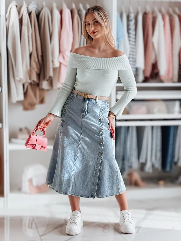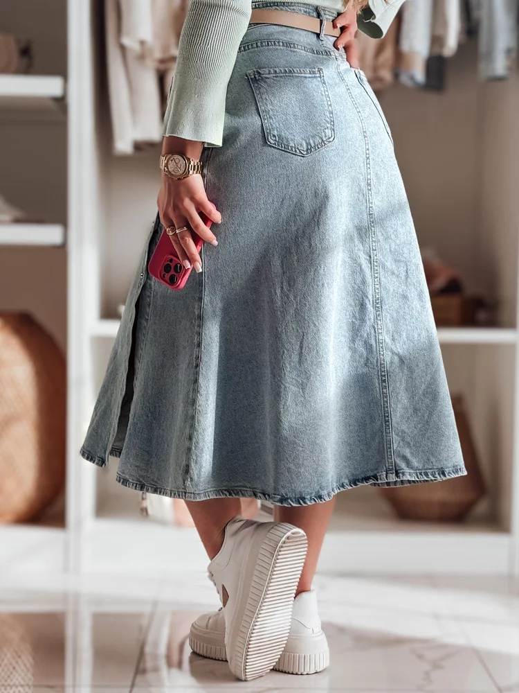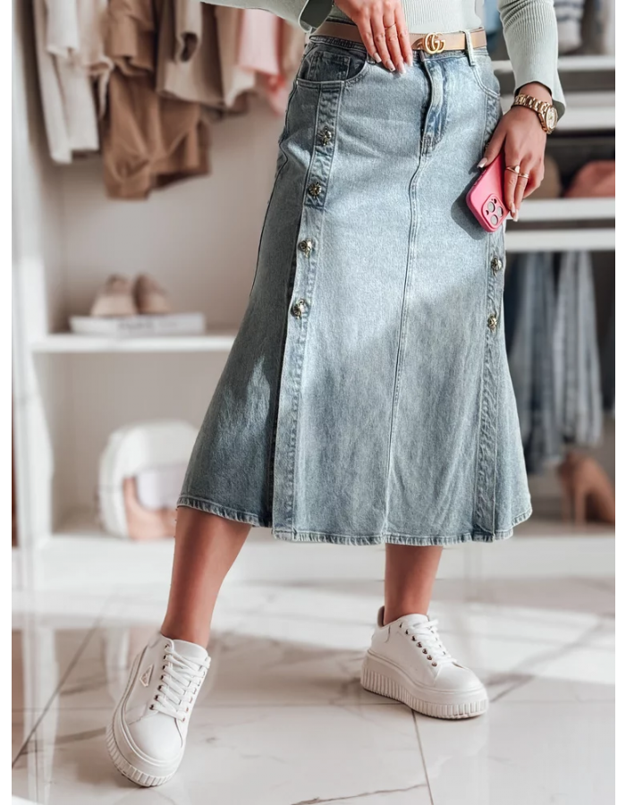 Efektowna jeansowa spódnica midi z guzikami po bokach, które nadają jej wyjątkowego stylu. Wysoki stan podkreśla talię, a luźny, zwiewny fason gwarantuje swobodę ruchów. Klasyczne kieszenie i praktyczne zapięcie sprawiają, że to doskonały wybór do wielu stylizacji, od codziennych po eleganckie.