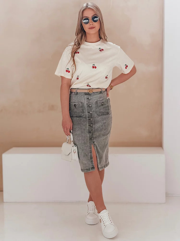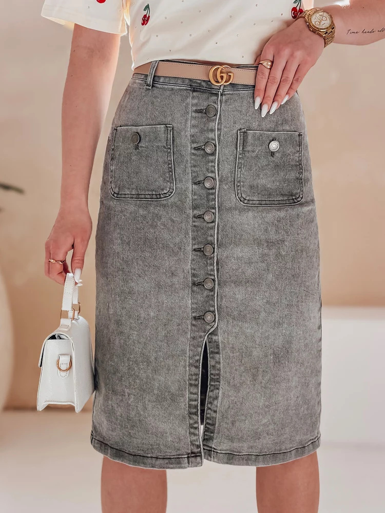 Spódnica jeansowa midi z wysokim stanem i guziczkami na całej długości z przodu to modowy klasyk w nowoczesnym wydaniu. Model dopasowany w biodrach i lekko zwężany ku dołowi podkreśla sylwetkę, a ozdobne kieszenie z przodu i tyłu dodają stylowego luzu. Idealna na wiosenne spacery czy spotkania w mieście – świetnie łączy się z t-shirtem i sneakersami.
