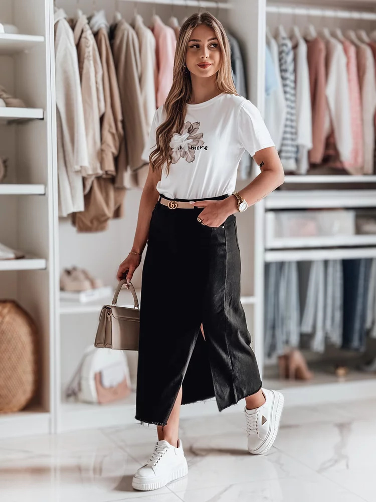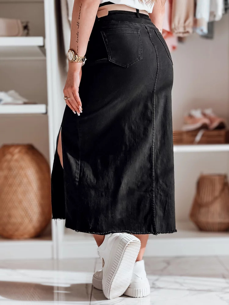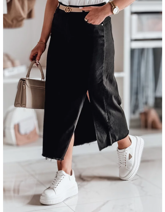Nowoczesna spódnica midi o wyjątkowym kroju. Wysoki stan pięknie podkreśla talię, a rozcięcie na boku dodaje subtelnej zmysłowości i swobody ruchu. Postrzępione wykończenie nadaje jej lekko surowego, streetwearowego charakteru. Ozdobne kieszenie zapewniają wygodę. Doskonała do casualowych i eleganckich outfitów.