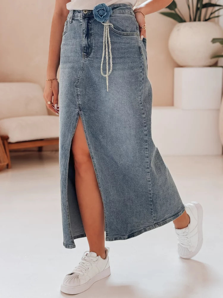 Jeansowa spódnica maxi o klasycznej, wydłużonej linii została zaprojektowana z myślą o codziennym komforcie i uniwersalnym stylu. Naturalna tkanina z dodatkiem elastanu zapewnia swobodę ruchów i dobre dopasowanie do sylwetki. Rozcięcie z przodu podkreśla lekkość formy i ułatwia chodzenie. Modny fason z ozdobnym kwiatem sprawdza się w zestawieniach casualowych oraz miejskich.