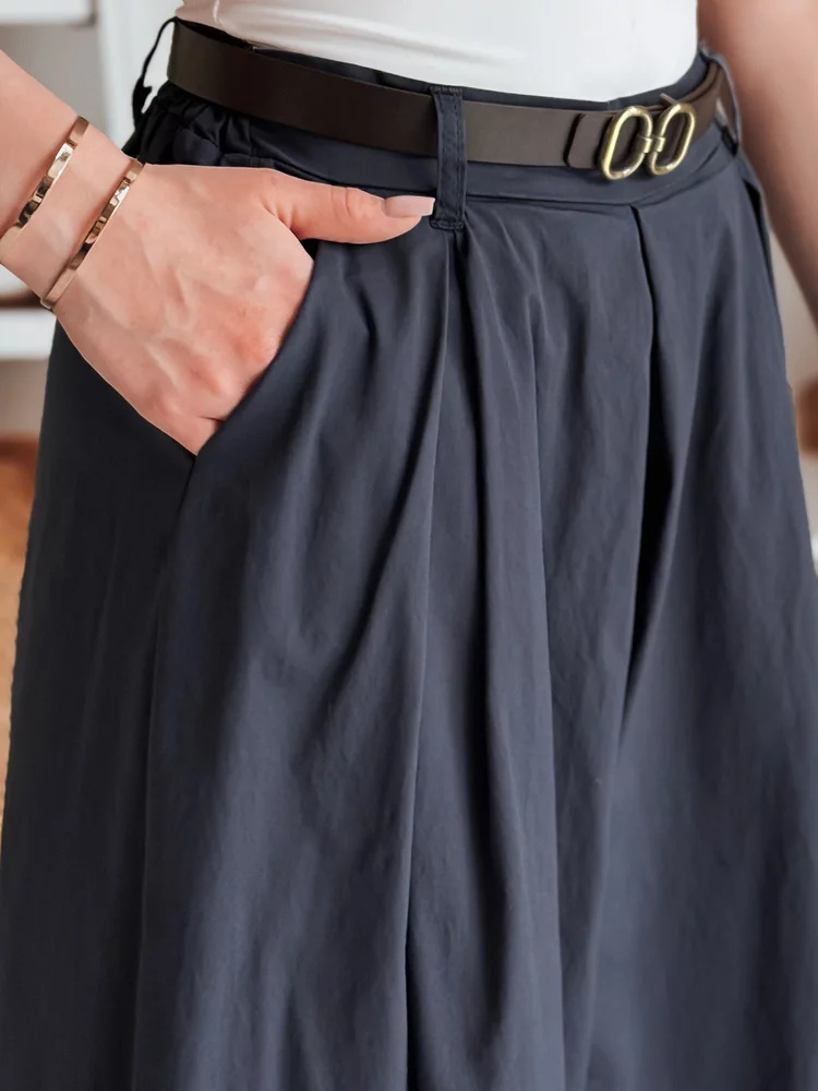 Spódnico-spodnie o wyjątkowo swobodnym kroju, które doskonale łączą komfort i styl. Wysoki stan pięknie podkreśla talię, a elastyczna gumka z tyłu zapewnia wygodę noszenia. Uniwersalny rozmiar pasuje od XS do L. Do zestawu dołączony jest pasek, który uzupełnia stylizację. Model wyposażony w dwie ozdobne kieszenie z przodu. Idealne na codzienne wyjścia oraz spotkania ze znajomymi.