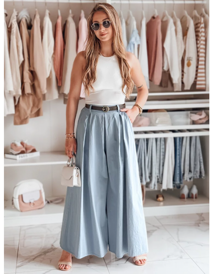 Spódnico-spodnie o wyjątkowo swobodnym kroju, które doskonale łączą komfort i styl. Wysoki stan pięknie podkreśla talię, a elastyczna gumka z tyłu zapewnia wygodę noszenia. Uniwersalny rozmiar pasuje od XS do L. Do zestawu dołączony jest pasek, który uzupełnia stylizację. Model wyposażony w dwie ozdobne kieszenie z przodu. Idealne na codzienne wyjścia oraz spotkania ze znajomymi.