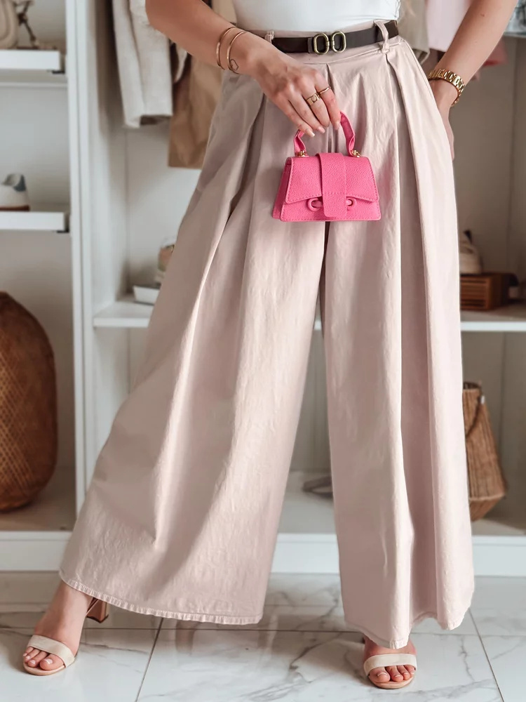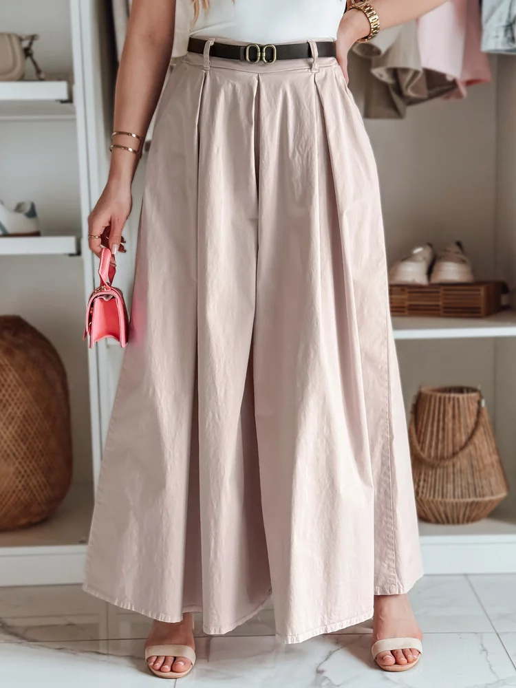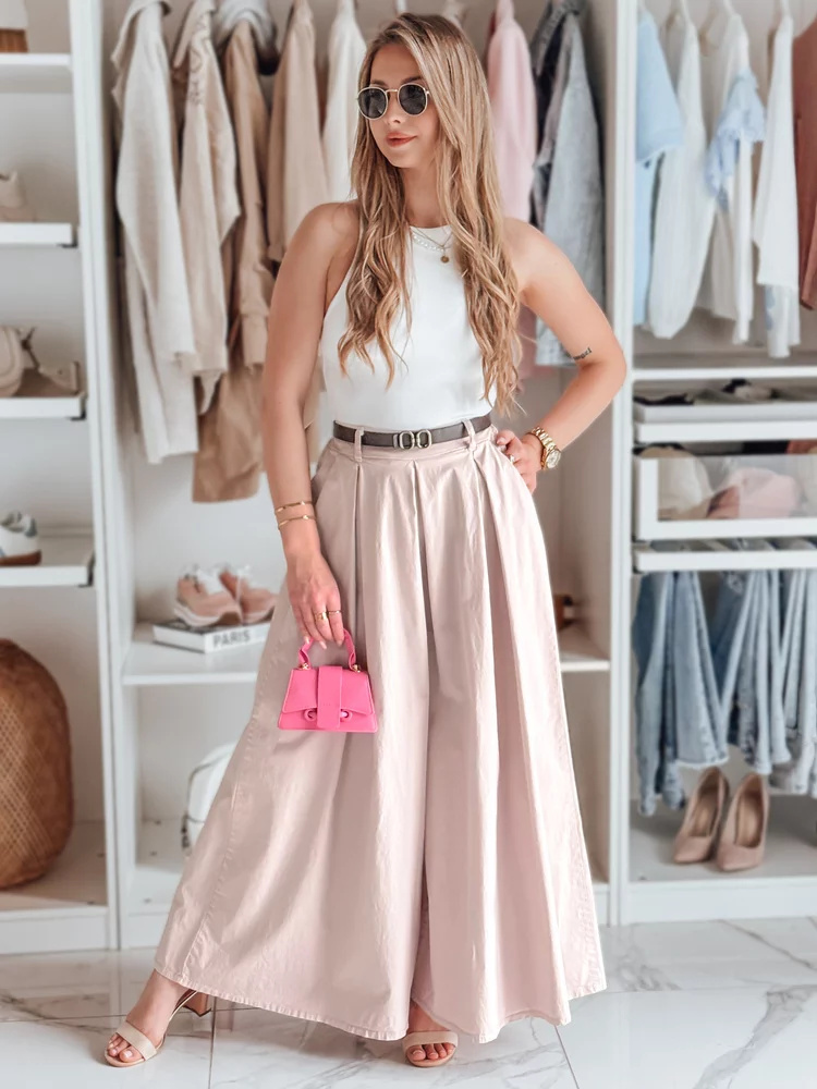 Spódnico-spodnie o wyjątkowo swobodnym kroju, które doskonale łączą komfort i styl. Wysoki stan pięknie podkreśla talię, a elastyczna gumka z tyłu zapewnia wygodę noszenia. Uniwersalny rozmiar pasuje od XS do L. Do zestawu dołączony jest pasek, który uzupełnia stylizację. Model wyposażony w dwie ozdobne kieszenie z przodu. Idealne na codzienne wyjścia oraz spotkania ze znajomymi.