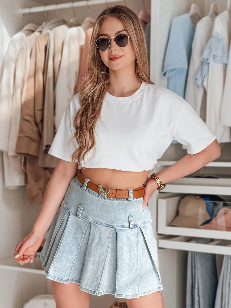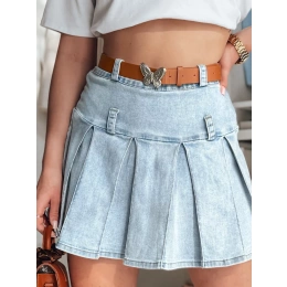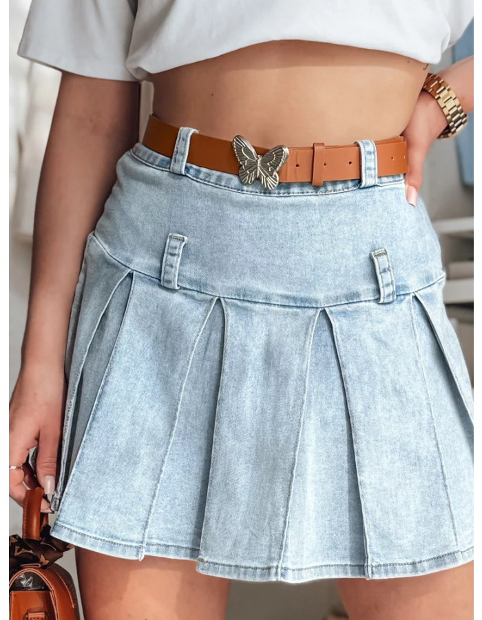 Jeansowa spódniczka mini z falbaną to modowy hit, który doda dziewczęcego uroku każdej stylizacji. Dopasowana w talii, podkreśla sylwetkę, a rozkloszowany dół nadaje lekkości. Wysoki stan podkreśla figurę, a pasek w zestawie uzupełnia całość. Idealna na co dzień, do sneakersów lub botków dla stylowego looku.