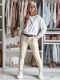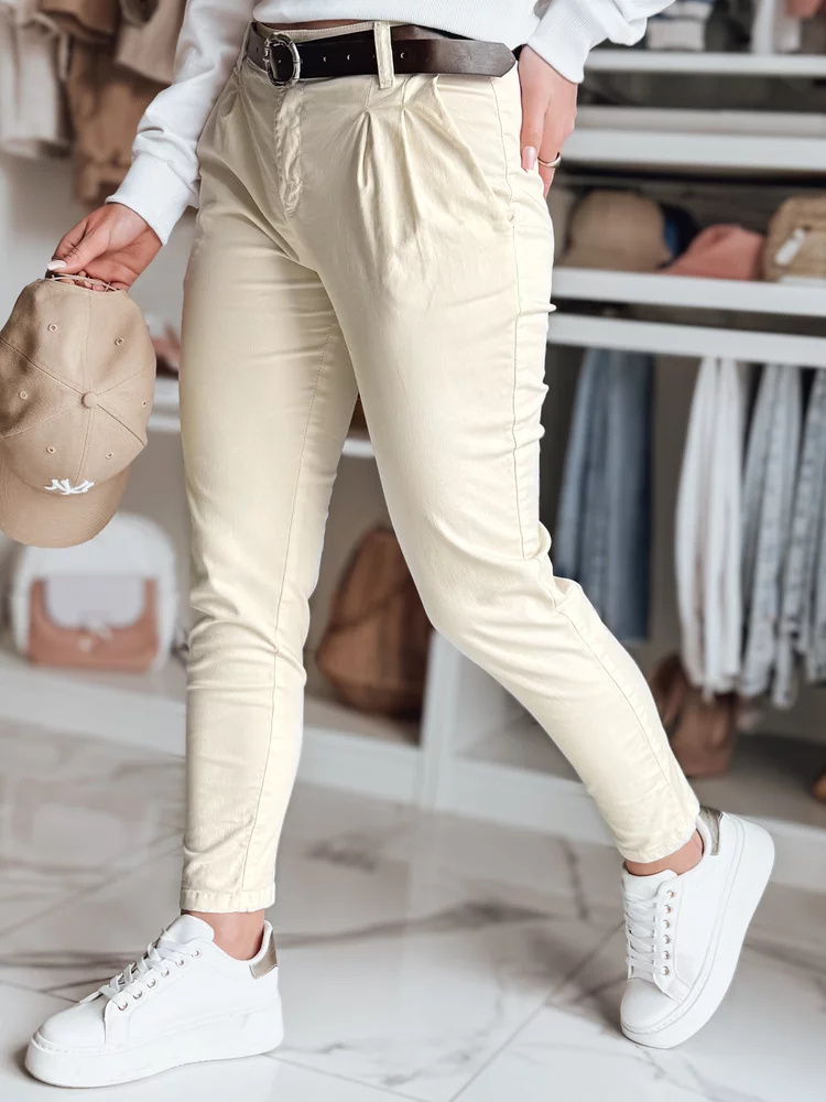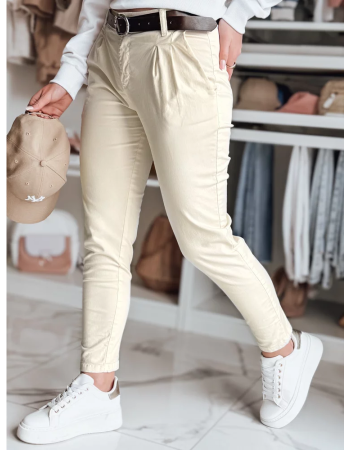 Eleganckie spodnie chinosy materiałowe o dopasowanym kroju, idealne do casualowych i bardziej formalnych stylizacji. Posiadają średni stan oraz ozdobne kieszenie z przodu. Pasek w zestawie podkreśla talię i dodaje wyrazistości. Zapięcie na guzik i zamek gwarantuje komfort noszenia. Świetnie komponują się z koszulą i sneakersami, tworząc modny, miejski look.