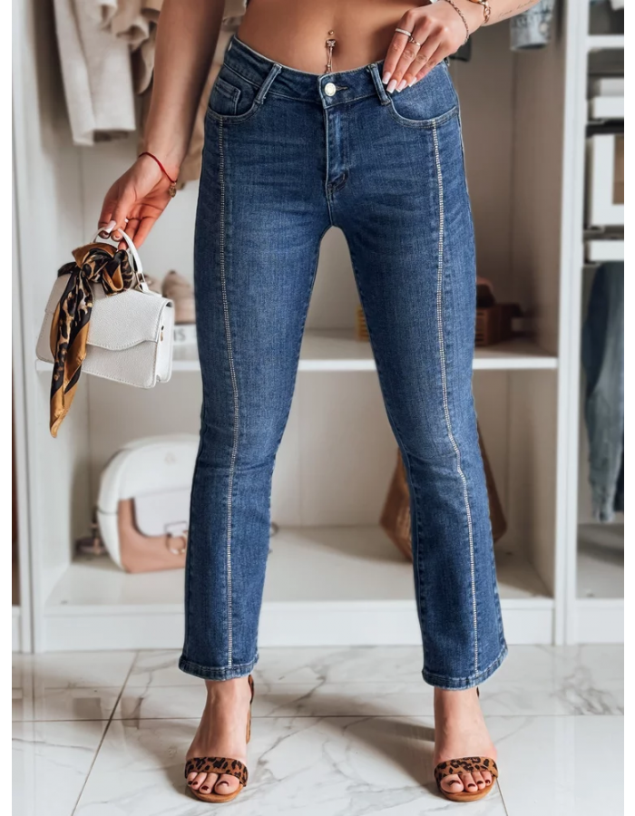 Damskie jeansy w stylu dzwonów z ozdobnymi cyrkoniami to połączenie wygody i modowego akcentu. Niski stan zapewnia komfort noszenia, a rozszerzane nogawki przed kostkę nadają sylwetce lekkości. Ozdobne kieszenie i zapinanie na guzik sprawiają, że to ponadczasowy model, który doskonale sprawdzi się w codziennych i bardziej stylowych zestawach.