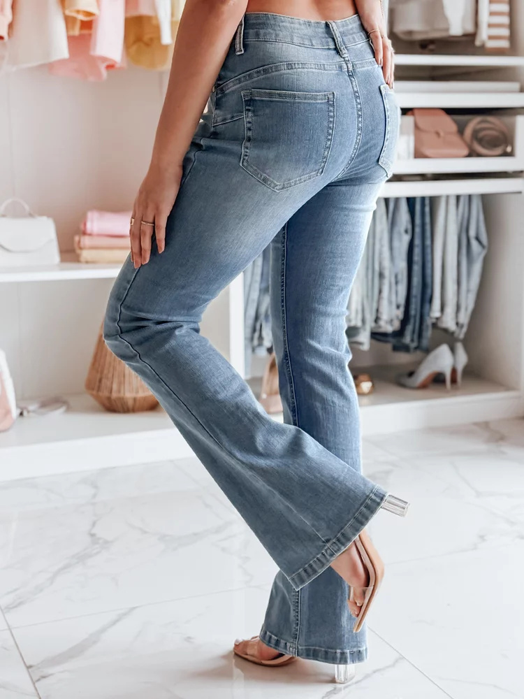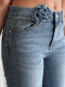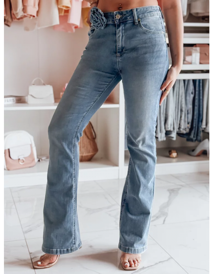 Nowoczesny jeans w stylu retro. Te spodnie dzwony to połączenie ponadczasowego fasonu z modnymi akcentami. Średni stan gwarantuje wygodę, a ozdobny kwiat dodaje subtelnej kobiecości oraz uroku. Zapinane na klasyczny zamek i guzik, pięknie podkreślają biodra, jak i wysmuklają nogi. Świetnie komponują się z dopasowanymi bluzkami oraz butami na obcasie.