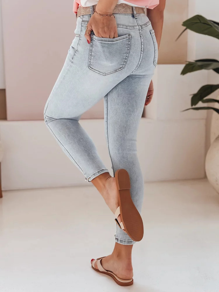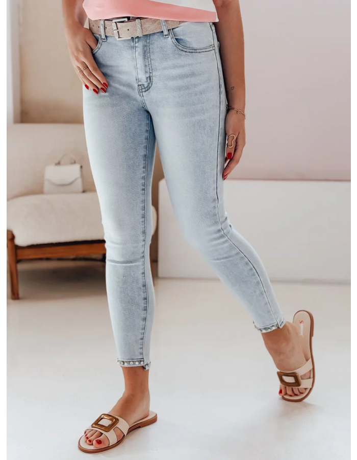 Jeansy damskie slim fit z wysokim stanem i dekoracyjnym wykończeniem perełkami to modna baza do wiosennych stylizacji. Dopasowany fason z dodatkiem spandexu wysmukla nogi, a połyskujące detale przyciągają spojrzenia. Idealne do casualowych looków z t-shirtem i sandałkami.