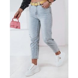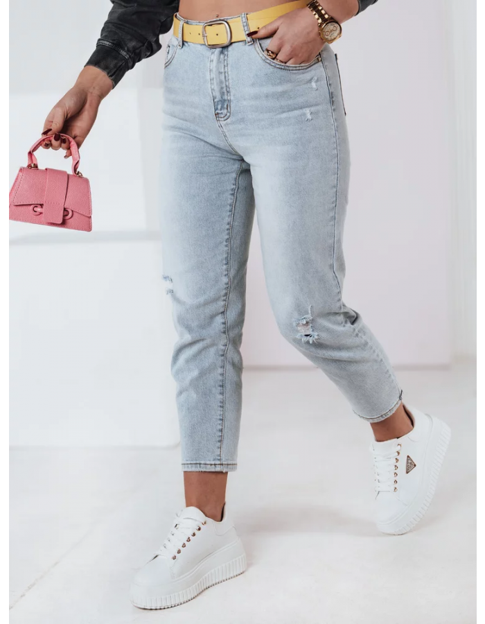 jeansy mom fit z subtelnymi przetarciami, które podkreślają ich charakter. Model ten posiada pasek w zestawie, który dodaje uroku. Wysoki stan modeluje sylwetkę, a nogawki 7/8 dodają nowoczesności. To model, który doskonale uzupełni garderobę, sprawdzając się w wielu zestawieniach.