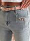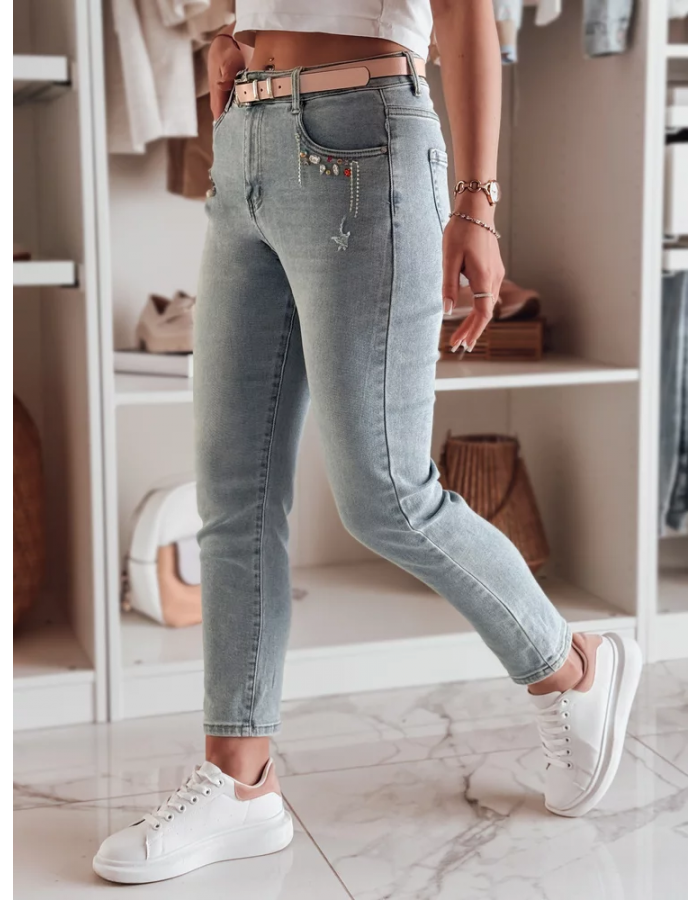 Spodnie jeansowe o dopasowanym kroju skinny, które wyróżniają się stylowymi ozdobami w postaci kryształków przy kieszeniach. Klasyczne zapięcie na guzik i zamek zapewnia wygodę noszenia, a delikatne przetarcia na nogawkach nadają im modowego charakteru. Wysoki stan dopasowuje się do figury i ją wyszczupla. Świetny wybór dla miłośniczek unikalnych detali i eleganckiego wykończenia.