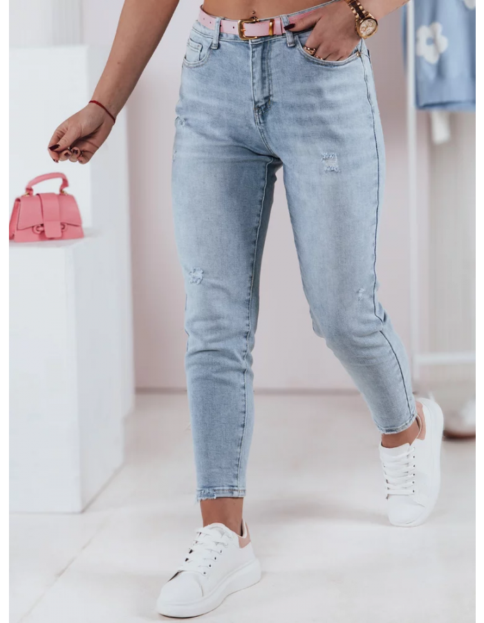 Dopasowane jeansy skinny, które podkreślają sylwetkę. Model ten posiada nogawki 7/8. Wysoki stan oraz wąski fason modelują sylwetkę. Przetarcia na spodniach dodają im charakteru. Do spodni jest dodany uroczy pasek. Świetnie sprawdzą się zarówno w casualowych, jak i bardziej eleganckich stylizacjach.