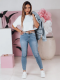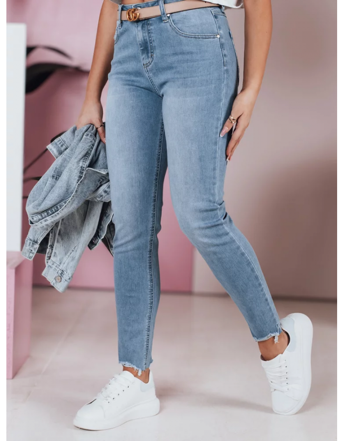 Spodnie jeansowe typu skinny ze średnim stanem. Wąskie nogawki wyszczuplają optycznie nogi a lekko podwyższony stan modeluje sylwetkę. Klasyczne detale, takie jak pięć kieszeni i suwak z guzikiem, dodają praktyczności. Delikatnie postrzępione wykończenie nogawek dodaje modnego, casualowego charakteru, idealnego na codzienne stylizacje.