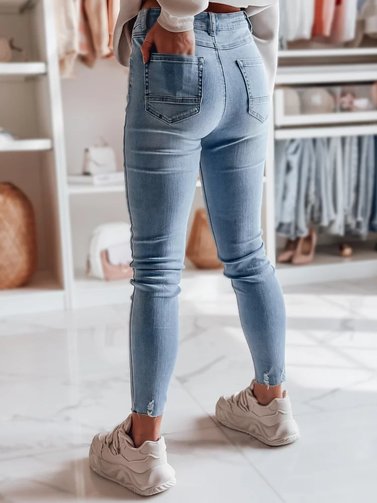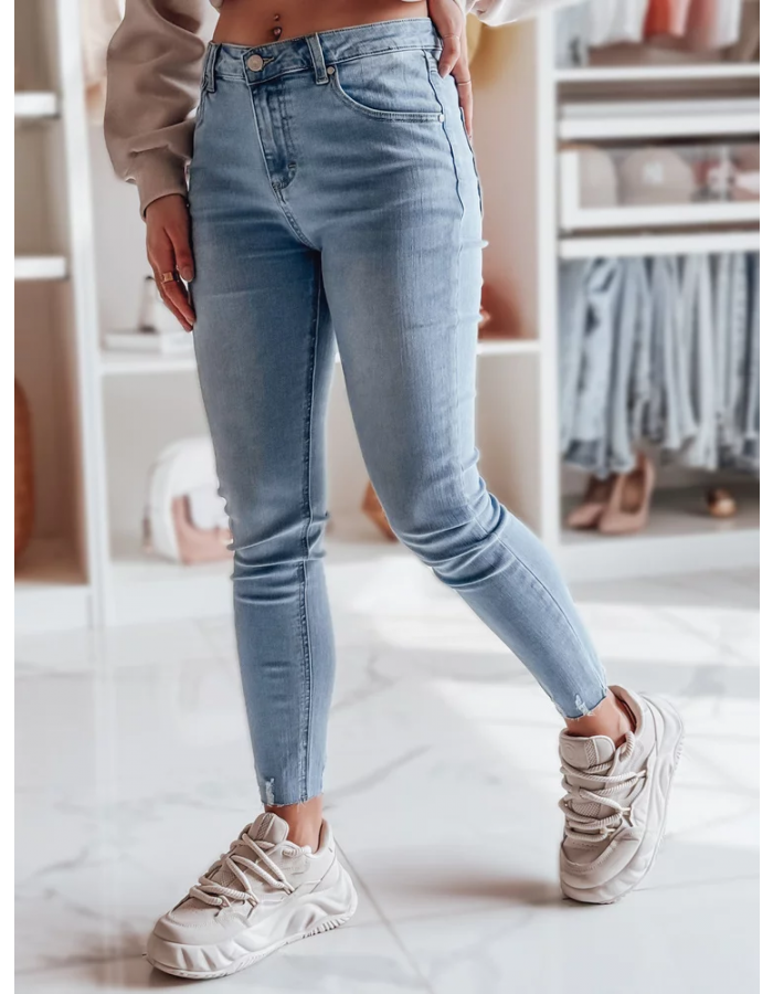 Wygodne spodnie jeansowe typu skinny to must-have w szafie na sezon wiosenny. Średni stan i dopasowany krój pięknie podkreślają linię talii i bioder, a efekt push-up modeluje pośladki. Klasyczne kieszenie oraz zamek z guzikiem podkreślają uniwersalny charakter. Surowe wykończenie nogawek nadaje Charakteru. Idealne na co dzień i do casualowych stylizacji.