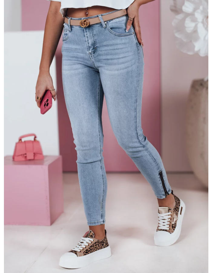 Spodnie damskie jeansowe tylu skinny z lekko podwyższonym stanem. Przylegające nogawki wyszczuplają nogi a zdobienia na nich w formie zamków po bokach dodają nowoczesności i stylu. Świetnie komponują się z casualowymi stylizacjami, podkreślając nowoczesny look.