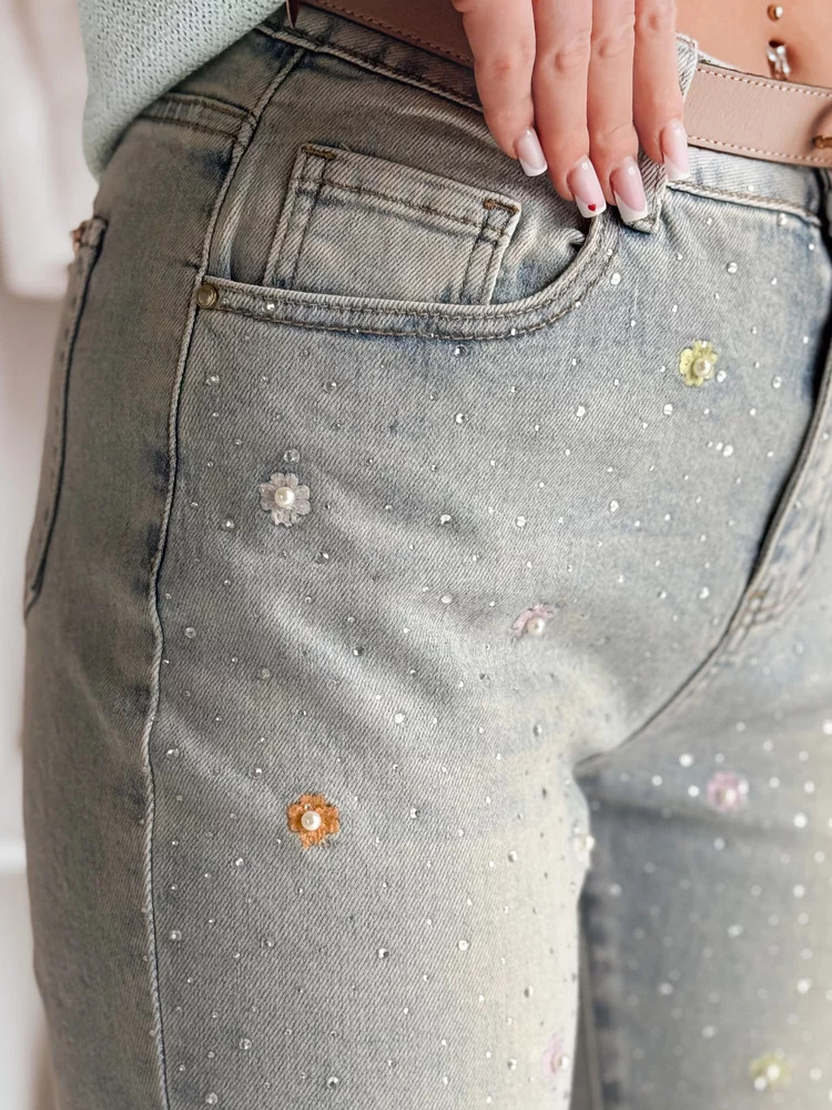 Spodnie damskie skinny o kobiecym kroju, ozdobione subtelnymi perełkami i kwiatuszkami. Model z wysokim stanem, ozdobnymi kieszeniami oraz praktycznym zapięciem na guzik i zamek. Efektowne zdobienia dodają im unikalnego charakteru, sprawiając, że są świetnym wyborem na wyjątkowe okazje.