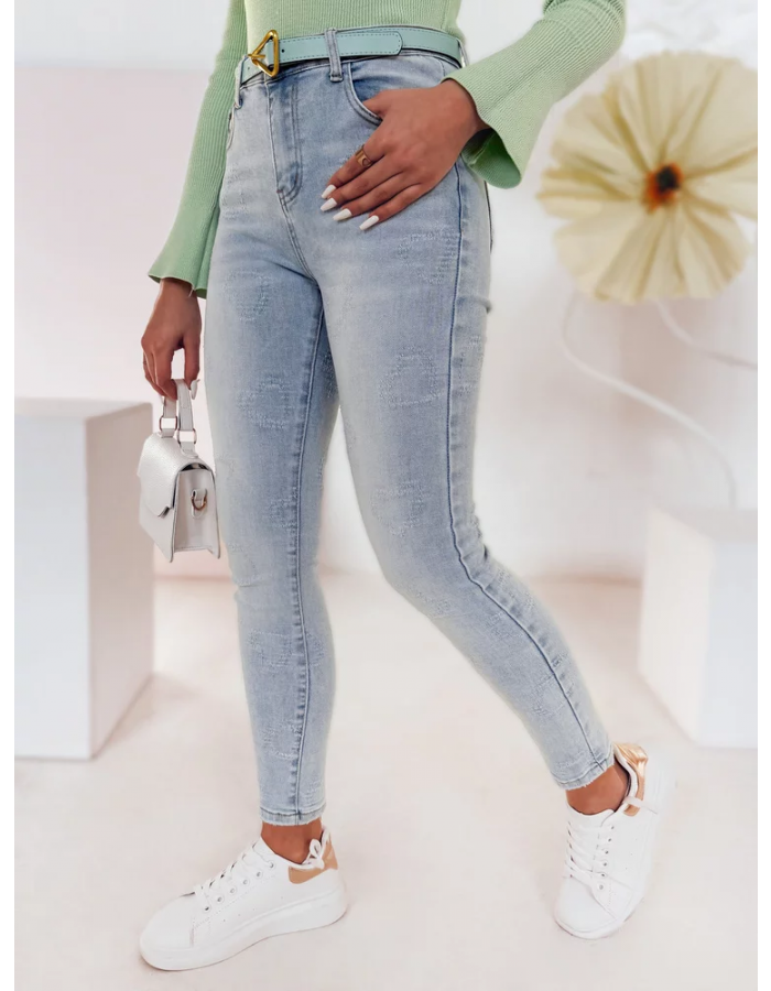 Damskie spodnie jeansowe o kroju skinny, ozdobione haftami w kształcie serc. Zapinane na guzik i zamek, posiadają ozdobne kieszenie i lekko podwyższony stan, który podkreśla talię. Przetarcia na nogawkach dodają im modnego, casualowego charakteru. Idealne do wielu modnych stylizacji.