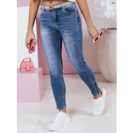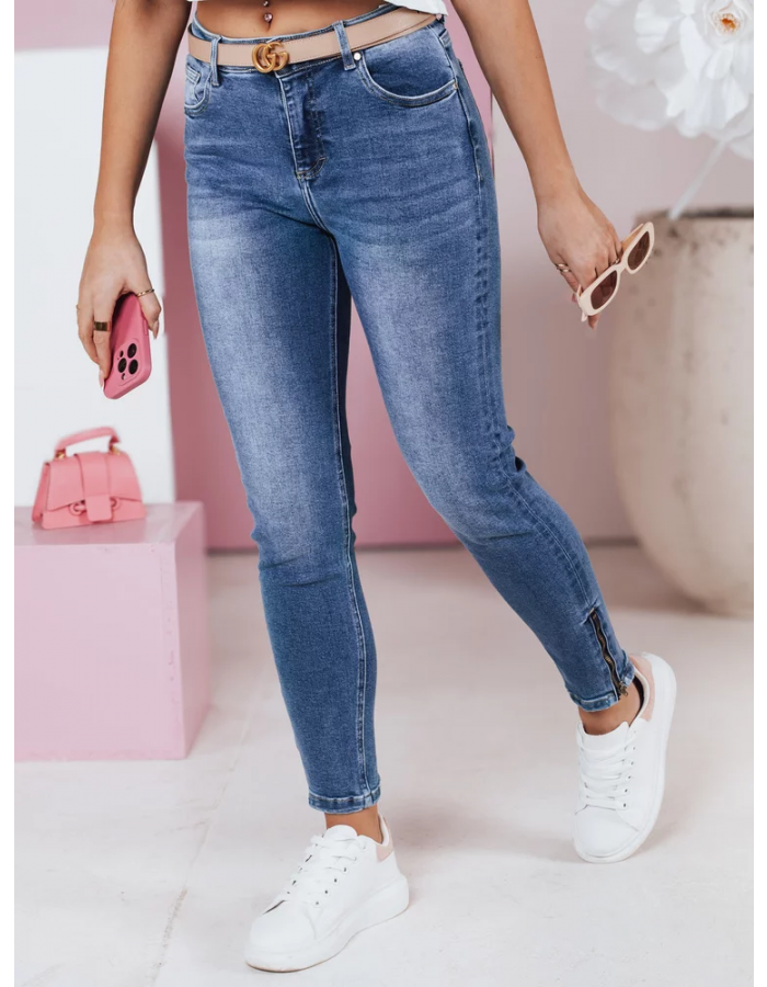 Jeansy damskie o kroju skinny ze średnim stanem oraz wieloma kieszeniami. Posiadają ozdobne zapięcia po bokach obu nogawek. Wąskie nogawki optycznie podkreślają sylwetkę oraz wyszczuplają nogi. Idealne na co dzień, pozwolą stworzyć zarówno casualowy, jak i bardziej elegancki look.