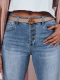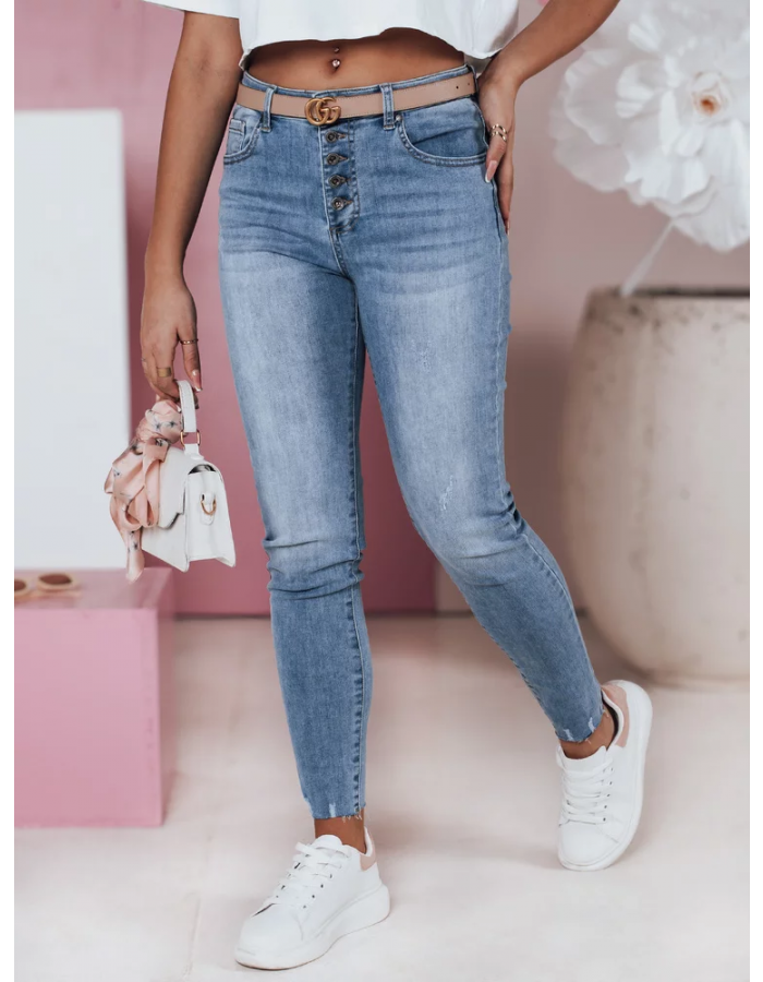 Jeansowe spodnie skinny z nogawkami 7/8. Wysoki stan podkreśla figurę, a wąskie nogawki wydłużają oraz wyszczuplają nogi. Model posiada zdobienia w postaci postrzępionych nogawek i wielu guzików. Idealny wybór na wiosenne spacery, zakupy czy spotkania z przyjaciółmi.
