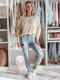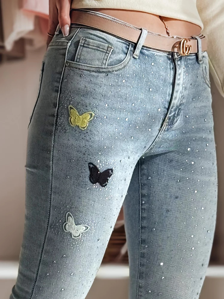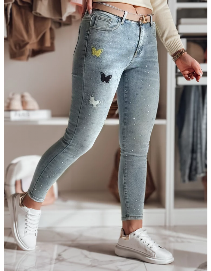Jeansy skinny z efektem glamour. Dopasowany krój podkreśla sylwetkę oraz wyszczupla optycznie nogi, a średni stan zapewnia komfort noszenia. Nogawki ozdobione subtelnymi cyrkoniami i haftowanymi motylami dodają oryginalności. Ozdobne kieszenie podkreślają urok modelu. Modne spodnie, które świetnie komponują się zarówno z casualowymi, jak i eleganckimi stylizacjami.