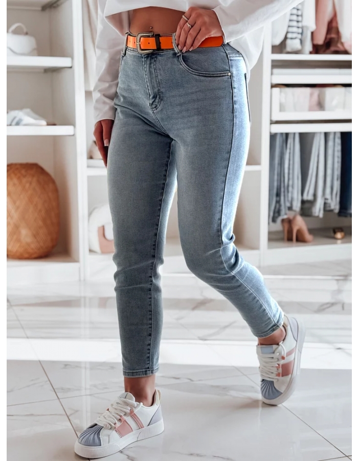 Spodnie damskie jeansowe o kroju slim fit z wysokim stanem, które pięknie podkreślają sylwetkę oraz optycznie wydłużają nogi. Zapinane na guzik i zamek, posiadają ozdobne kieszenie oraz efekt push-up dla lepszego dopasowania. Gwarantują komfort noszenia na co dzień i do bardziej eleganckich stylizacji.