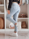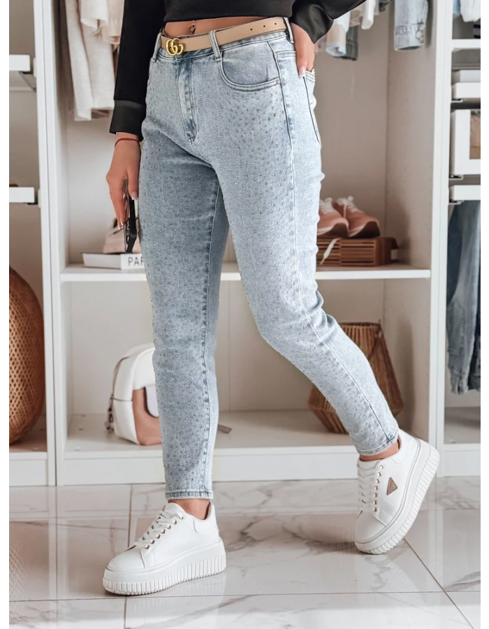 Jeansy slim fit z wysokim stanem, które podkreślają sylwetkę i optycznie wysmuklają nogi. Klasyczne ozdobne kieszenie i zapięcie na guzik oraz zamek dodają funkcjonalności, a całość urozmaicają subtelne, przeźroczyste diamenciki. Efektowny design świetnie komponuje się zarówno z eleganckimi, jak i casualowymi stylizacjami.