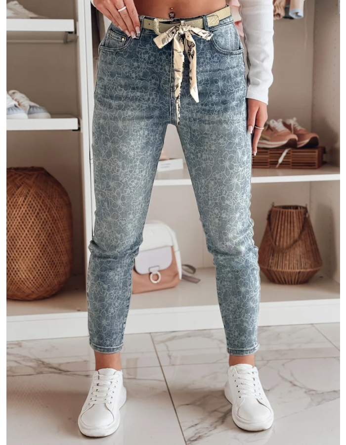 Stylowe jeansy damskie z wysokim stanem, które doskonale podkreślają sylwetkę. Model slim fit zapewnia idealne dopasowanie, a subtelny kwiatowy wzór dodaje unikalnego charakteru. Klasyczne kieszenie sprawiają, że są praktyczne na co dzień. W zestawie ozdobny pasek, który dopełnia całość. Idealne do codziennych, jak i bardziej eleganckich stylizacji.