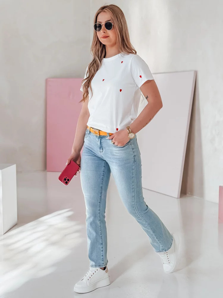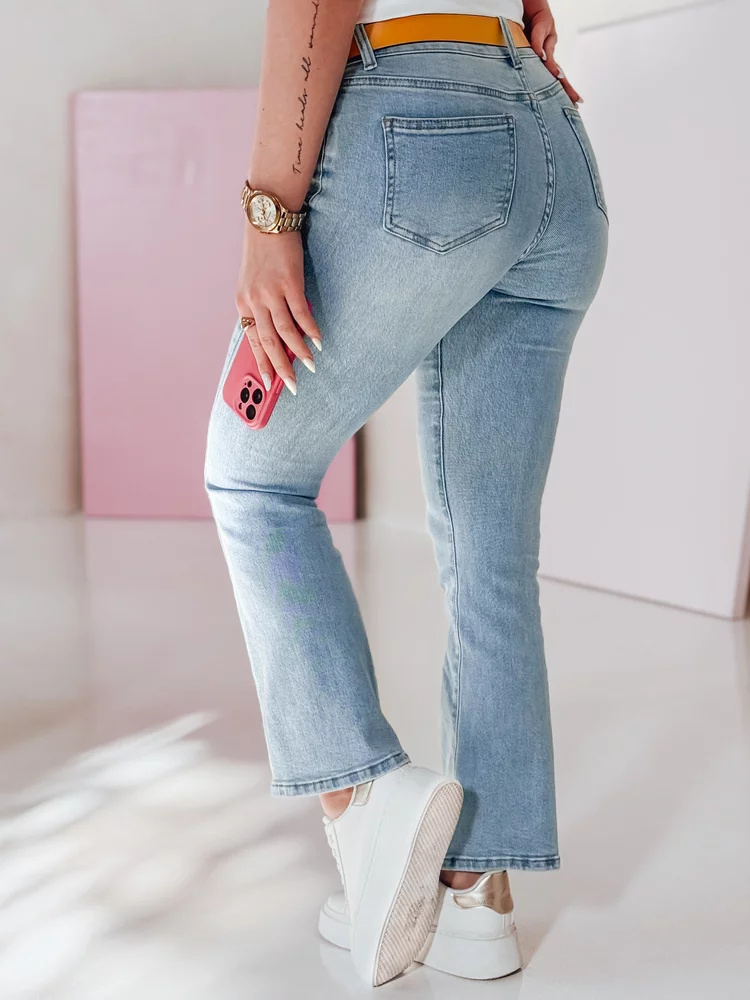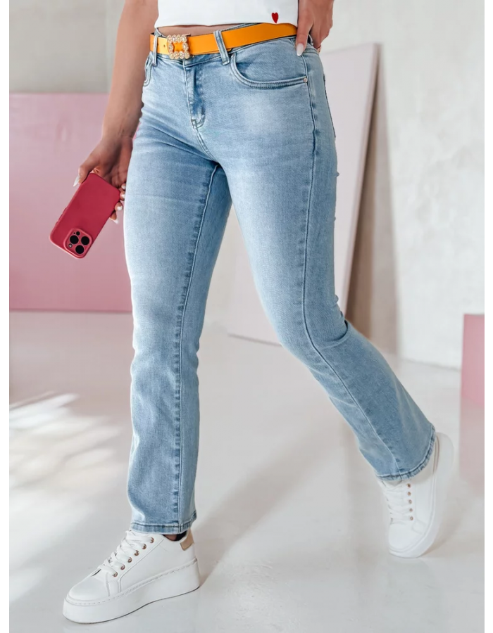 Damskie jeansy straight leg o klasycznym kroju i średnim stanie to doskonały wybór na co dzień. Model zapinany na zamek i guzik, posiada ozdobne kieszenie oraz dołączony pasek z dekoracyjną klamrą, który dodaje całości stylowego akcentu. Prosty fason optycznie wysmukla sylwetkę, zapewniając swobodę ruchów i komfort noszenia. Idealne na wiosnę i codzienne stylizacje.