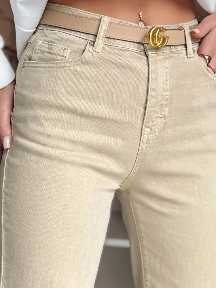 Klasyczne spodnie jeansowe.Prosta nogawka lekko opinająca uda pozwala na komfort i styl w jednym. Wysoki stan modeluje sylwetkę. Idealne na co dzień i wyjątkowe okazje, łączą komfort noszenia z ponadczasowym wyglądem.