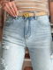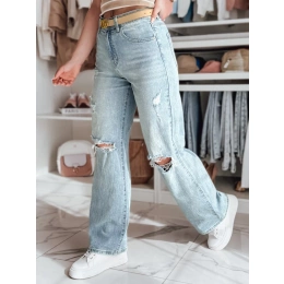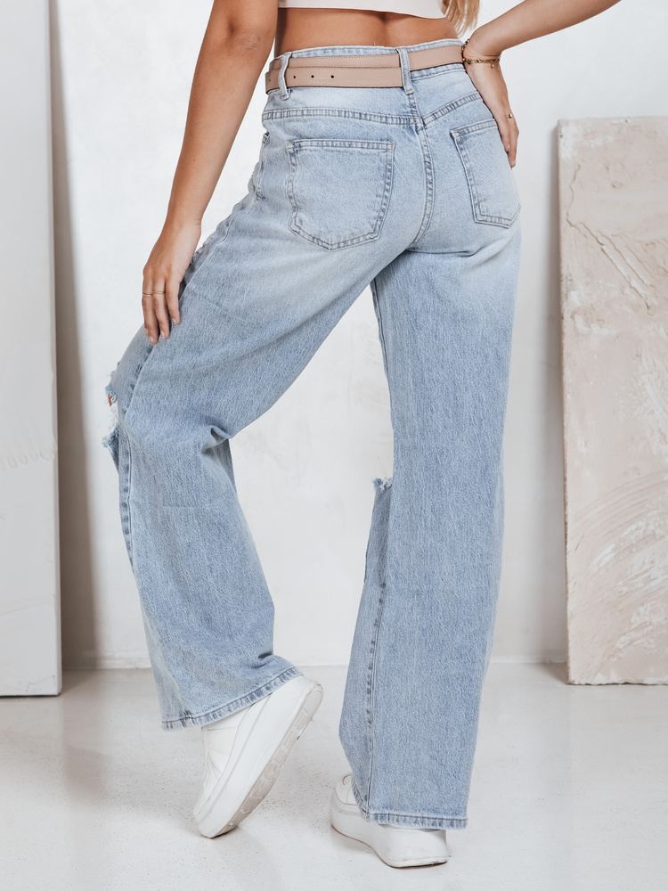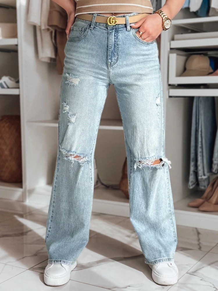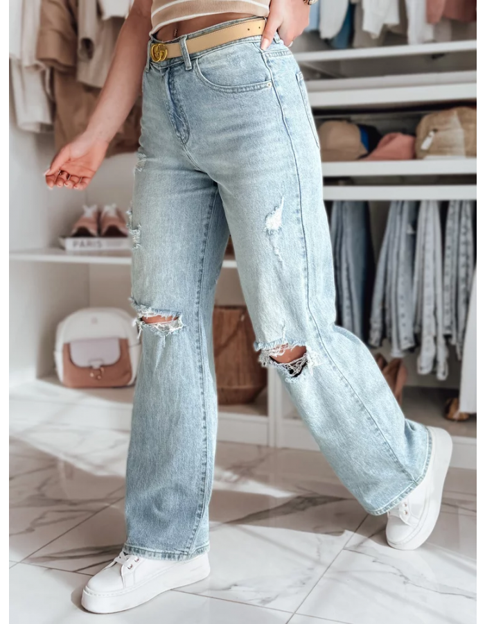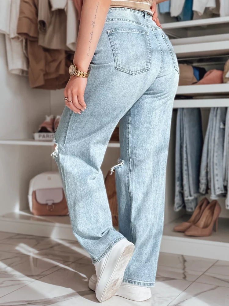 Jeansowe spodnie baggy z wysokim stanem i ozdobnymi przetarciami to idealne połączenie stylu i wygody. Klasyczny fason z pięcioma kieszeniami i zapięciem na guzik oraz suwak podkreśla ponadczasowy charakter. Szerokie nogawki dodają nonszalancji i zapewniają pełną swobodę ruchów. Wysoki stan optycznie wydłuża nogi oraz podkreśla figurę. Model idealny na co dzień i do casualowych stylizacji.