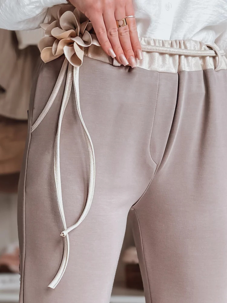Spodnie damskie casualowe masełko z prostą nogawką to połączenie wygody i elegancji. Gumka w pasie zapewnia komfort noszenia, a ozdobny sznurek z kwiatami dodaje unikalnego charakteru. Klasyczne kieszenie podkreślają urok, a podwyższony stan pięknie modeluje sylwetkę. Idealne na codzienne stylizacje.