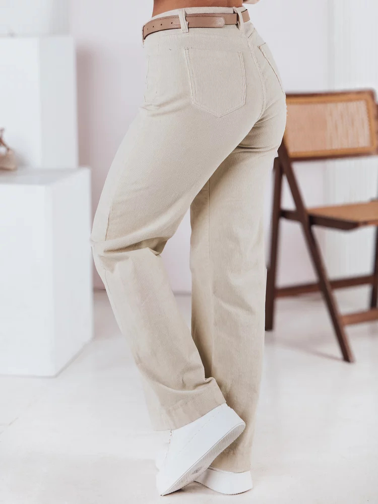 Stylowe spodnie sztruksowe o nogawkach wide leg to klasyka w nowoczesnym wydaniu. Średni stan zapewnia wygodę, a ciekawe kieszenie z przodu i tyłu dodają uroku. Model zapinany na guzik i zamek. Przyjemna w dotyku tkanina świetnie sprawdza się w casualowych i eleganckich stylizacjach.