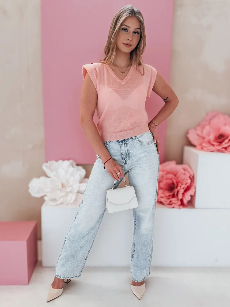 Modne jeansy z kryształkami i wysokim stanem, które łączą wygodę i elegancki akcent. Ozdobne przeźroczyste diamenciki dodają subtelnego blasku, a klasyczny fason optycznie wydłuża nogi. Zapinane na guzik i zamek, posiadają cztery tradycyjne kieszenie, co czyni je zarówno wygodnymi, jak i stylowym elementem garderoby na każdą okazje.