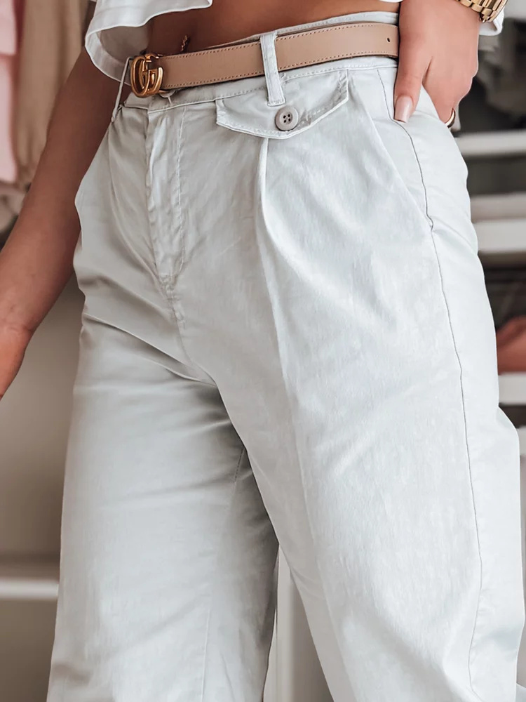 Spodnie wide leg z wysokim stanem to must-have w każdej garderobie. Dopasowana talia podkreśla sylwetkę, a rozszerzane nogawki optycznie wydłużają nogi. Zapinane na zamek i guzik, posiadają ozdobne kieszenie i urocze detale, które dodają im unikalnego charakteru. Bawełniane, lekkie spodnie to doskonała baza do codziennych stylizacji. Świetnie komponują się z casualowymi T-shirtami lub w mniej formalnych zestawach.