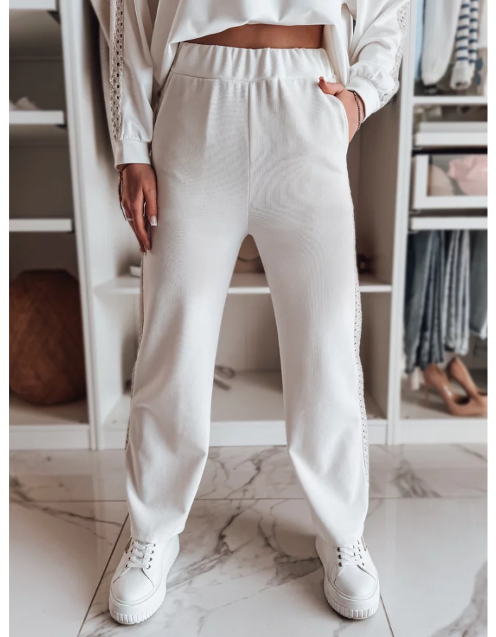 Prążkowane spodnie wide leg z elastyczną gumką w pasie, które zapewniają wygodę i idealne dopasowanie do sylwetki. Po bokach nogawek ozdobna koronka dodająca lekkości i stylowego akcentu. Dwie ozdobne kieszenie z przodu. Uniwersalny rozmiar pasuje od XS do L. Model łączy casualowy styl z eleganckimi detalami, pasując do wielu stylizacji.