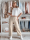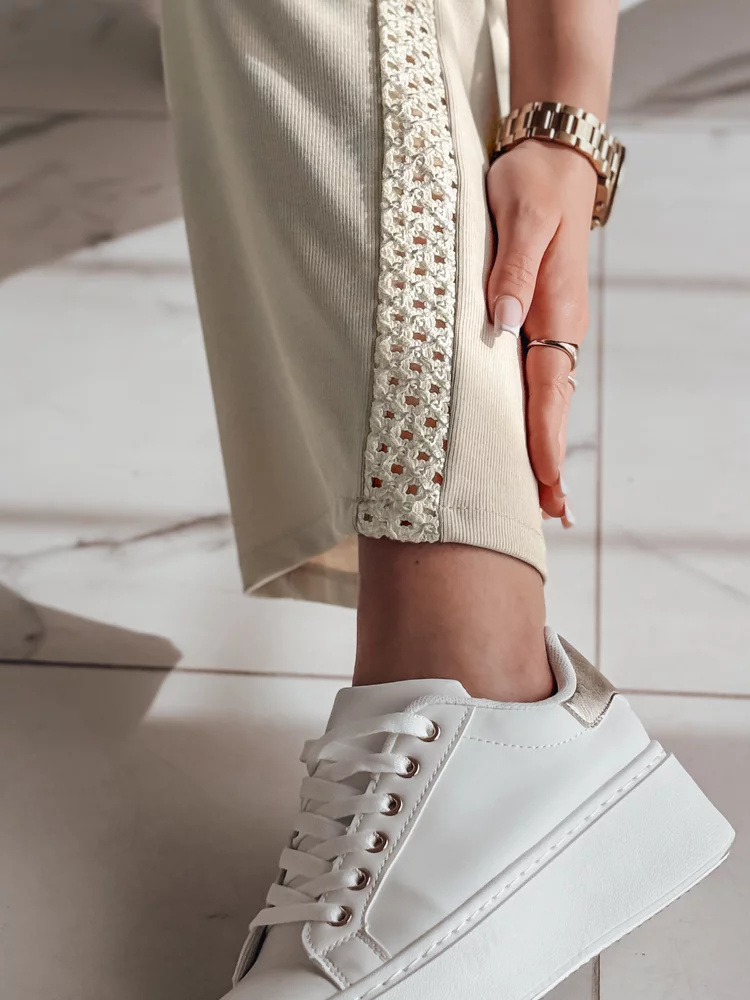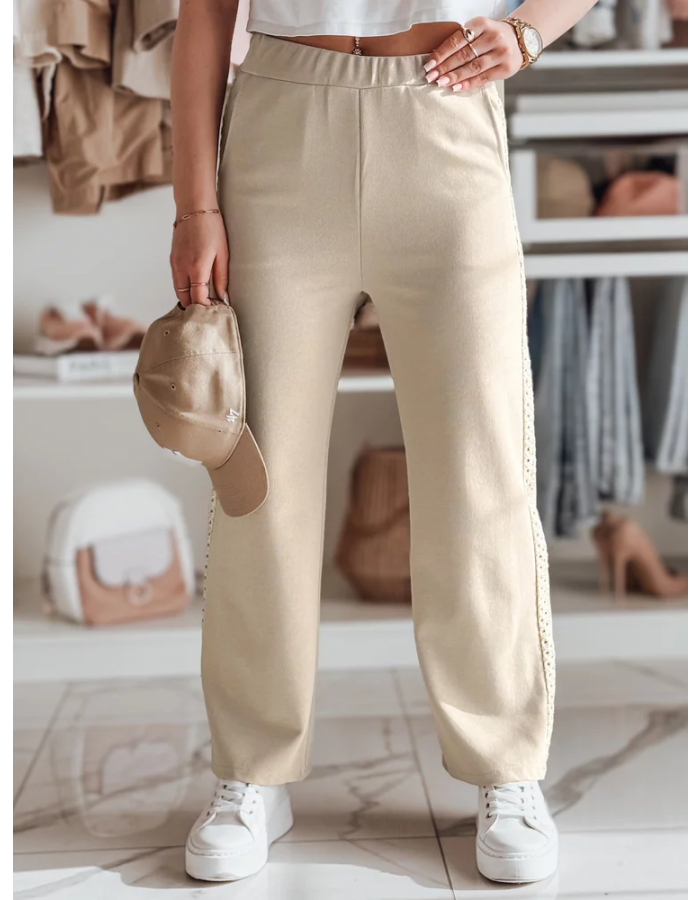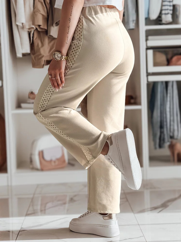 Prążkowane spodnie wide leg z elastyczną gumką w pasie, które zapewniają wygodę i idealne dopasowanie do sylwetki. Po bokach nogawek ozdobna koronka dodająca lekkości i stylowego akcentu. Dwie ozdobne kieszenie z przodu. Uniwersalny rozmiar pasuje od XS do L. Model łączy casualowy styl z eleganckimi detalami, pasując do wielu stylizacji.