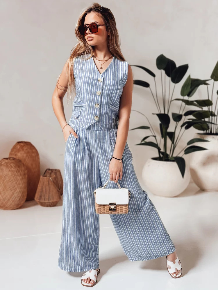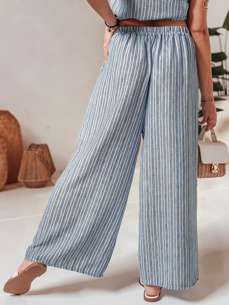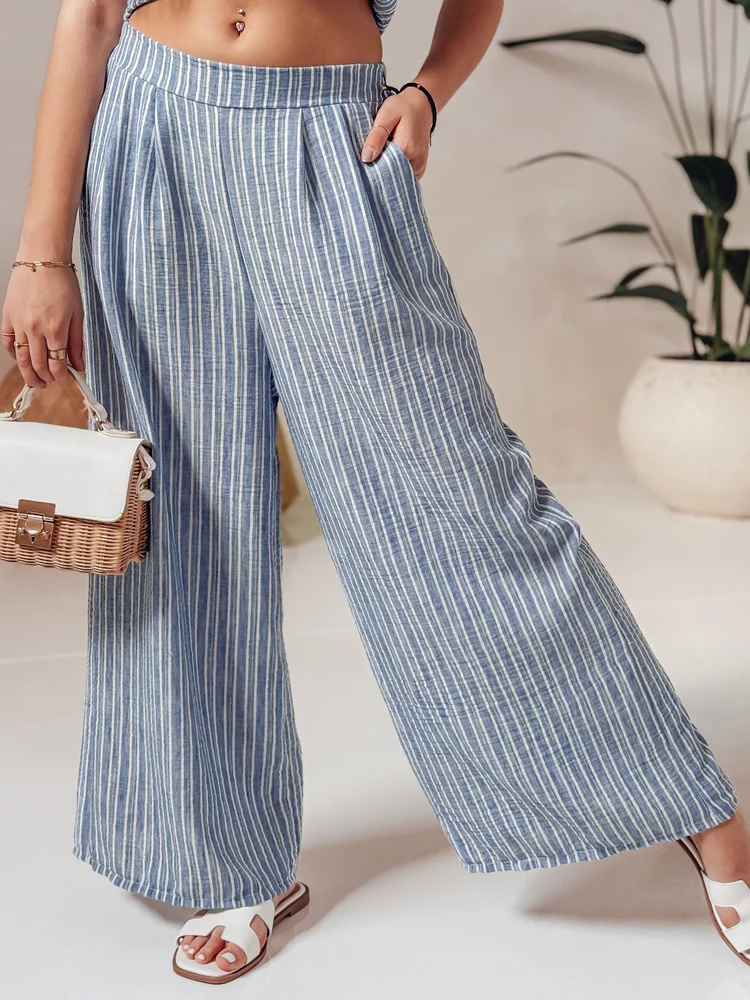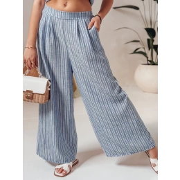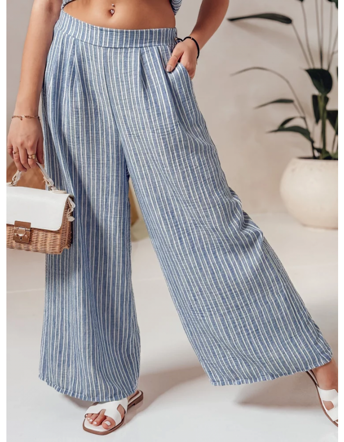Spodnie damskie typu wide leg z przewiewnego materiału to must-have na cieplejsze dni. Luźny krój zapewnia wygodę i swobodę ruchów, a średni stan oraz elastyczna gumka w pasie świetnie dopasowują się do sylwetki. Pionowe paski wysmuklają nogi, jak i dodają letniego luzu. Uniwersalny rozmiar pasuje od XS do L. Model one size, który sprawdzi się zarówno na urlopie, jak i w codziennych, niezobowiązujących stylizacjach.