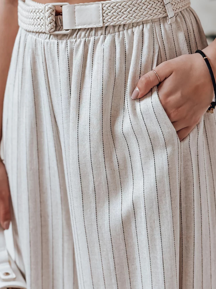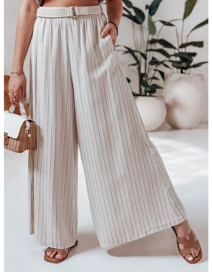 Damskie spodnie typu wide leg z wysokim stanem to połączenie wygody i eleganckiego luzu. Gumka w pasie zapewnia komfort noszenia, a dołączony pleciony pasek podkreśla talię. Lekki, przewiewny materiał sprawia, że model idealnie sprawdza się w ciepłe dni. Pionowe paski optycznie wydłużają i wysmuklają nogi, dodając sylwetce lekkości oraz nowoczesnego szyku. Uniwersalny rozmiar pasuje od XS do L. Świetne na sezon wiosna-lato do stylizacji miejskich i wakacyjnych.