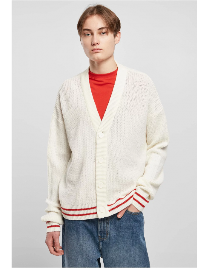 Pánský pletený kardigan uspokojí svým harmonickým stylem. Široký žebrovaný úplet doplňuje extra hluboký výstřih do V a knoflíková léga. Dva vodorovné pruhy na širokém žebrovém lemu a manžetách dodávají znatelný akcent. Dokonale podél linie je oversized střih se spadlými rameny. Hladký kardigan je vyroben z akrylu a polyamidu.