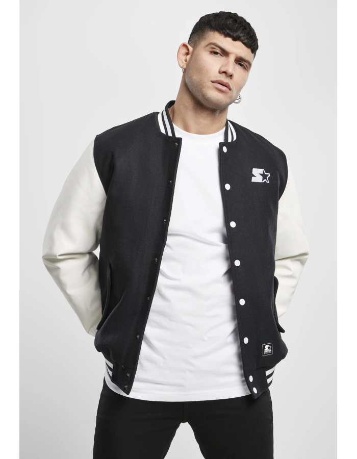 Sportovní a dynamická pánská bunda v autentickém americkém vysokoškolském stylu. Barvy černá a bílá jsou důmyslně kombinovány pro maximální efekt. Bílé rukávy ze syntetické kůže kontrastují s černým tělem bundy. Ten správný vysokoškolský nádech dodává dvojité pruhované manžety na rukávech a lemu a také lehký límeček ve stejném stylu. Bohatý kontrast má bílý knoflík na přední straně. Mimochodem, školní bunda obsahuje oficiální značku Starter: vyšívaný nápis na zádech a vyšívané logo na manžetě levého rukávu.