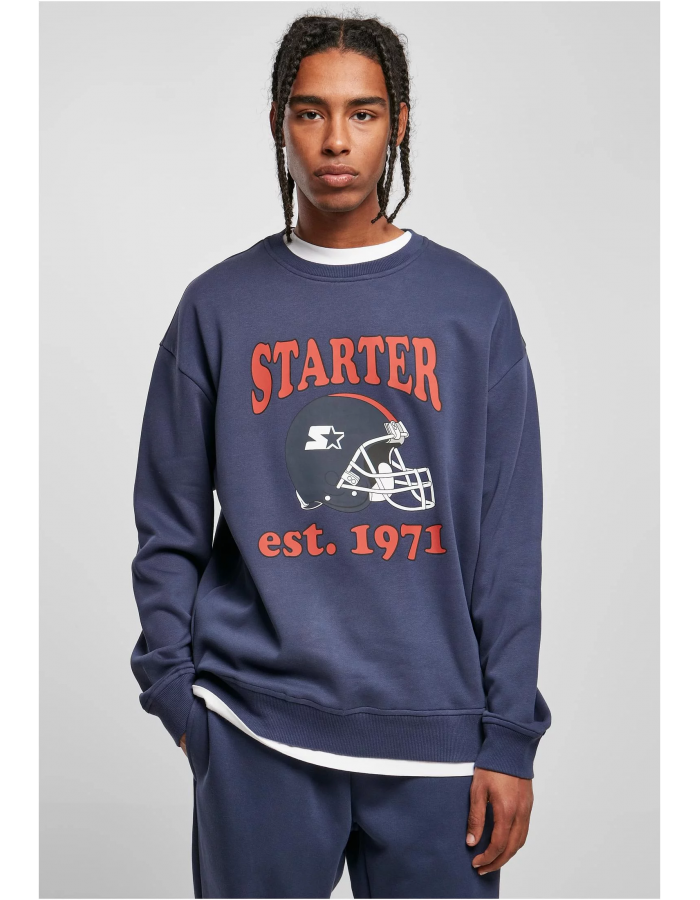 Pánský svetr Starter uspokojí ultrapohodlné nošení, chladný postoj a zavedenou značku. Kromě česaného fleecu, široké žebrované manžety a výstřih zajišťují ležérní vzhled. Pánský svetr je značkový s velkým fotbalovým motivem Starter, ladící helmou a nápisem loga. Střih je pravidelný.