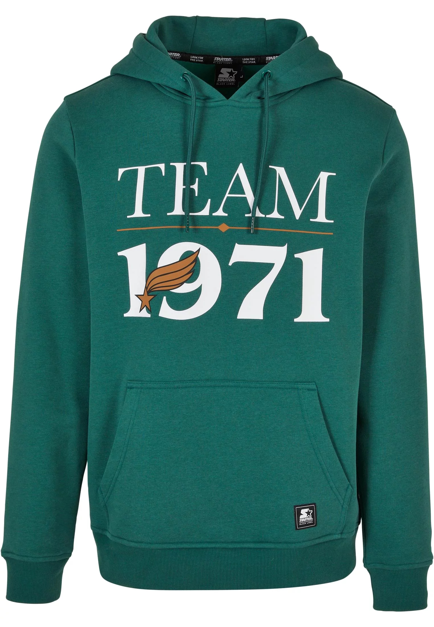 Na hrudi této moderní pánské mikiny s kapucí je velkými písmeny napsáno „Team 1971“. Svetr má tradičně kapuci se stahovacími šňůrkami, klokaní kapsu a široké manžety na rukávech a lemu. Jeho pravidelný střih je obzvlášť pohodlný. Hladká fleecová tkanina také dokonale zvyšuje pohodlí při nošení, zatímco ležérní a sportovní styl završují jemné značky – decentní loga Starter na klokaní kapse a na levém rukávu.