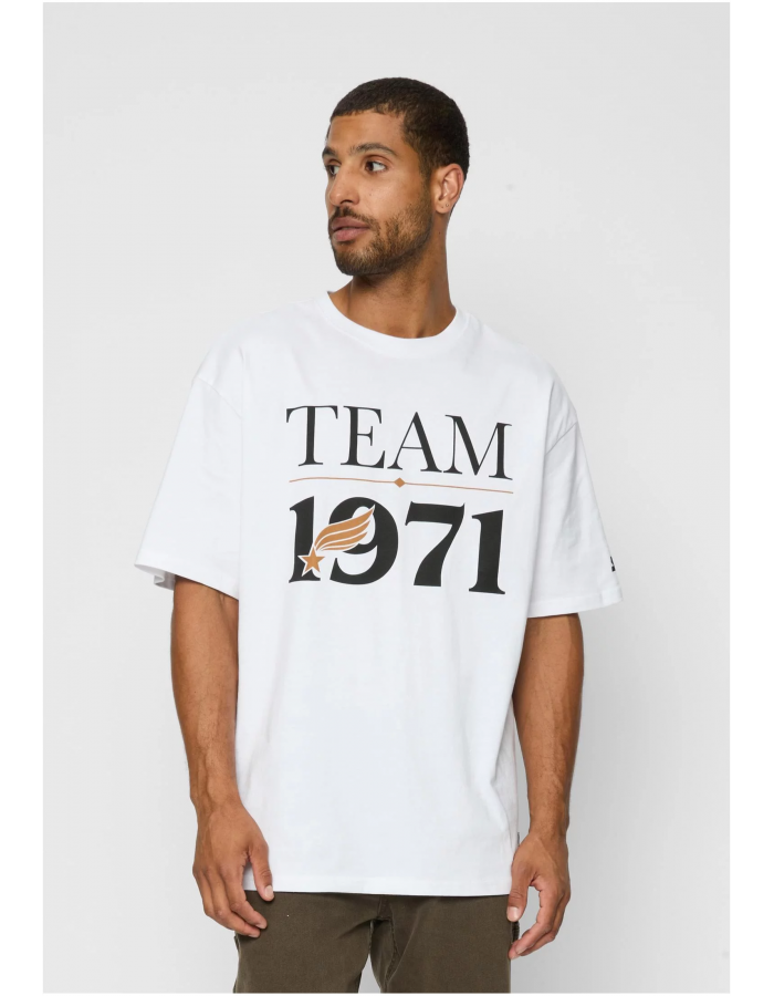 Toto jednobarevné pánské tričko s velkým potiskem „Team 1971“ uprostřed hrudi zaručeně zaujme. Její městský styl završuje pohodlný oversize střih. Pánské tričko je značkové s decentním logem Starter na levém rukávu a dalším na lemu. Nabízí kulatý výstřih a je vyrobena z jemné bavlny single jersey.