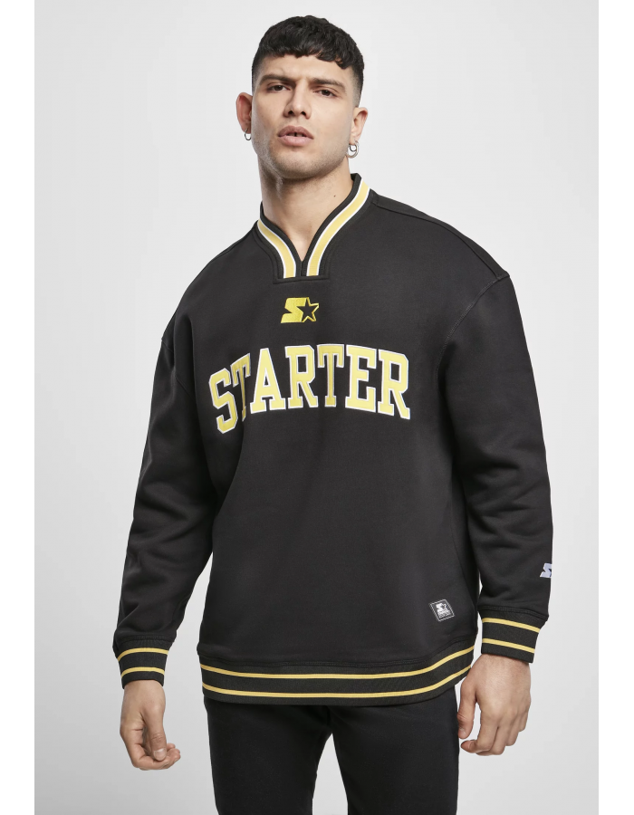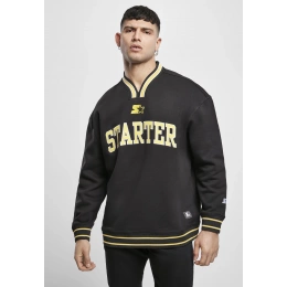 Extra sportovní dlouhé rukávy pro muže, které jsou neformálním způsobem založeny na americkém vysokoškolském stylu. Svetr má široký střih s překrývajícími se rukávy a typickými elastickými manžetami na rukávech a spodním lemu s dvojitým pruhem. Výstřih vybíhá v barevné špičce. Součástí brandu mikiny je vyšívaný nápis Starter na hrudi doplněný vyšívaným logem, které se opakuje na manžetě levého rukávu.