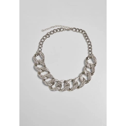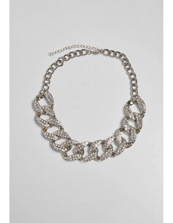 Krátký náhrdelník Urban Classics s velkými články řetízku je autentický poutač a je navíc opatřen kamínky. Zadní část tvoří menší články řetězu, přičemž samotný řetěz je dlouhý 38 centimetrů a je navíc velikostně nastavitelný pomocí jemného prodlužovacího řetězu. Pevný šperk je vyroben ze slitiny zinku a železa.