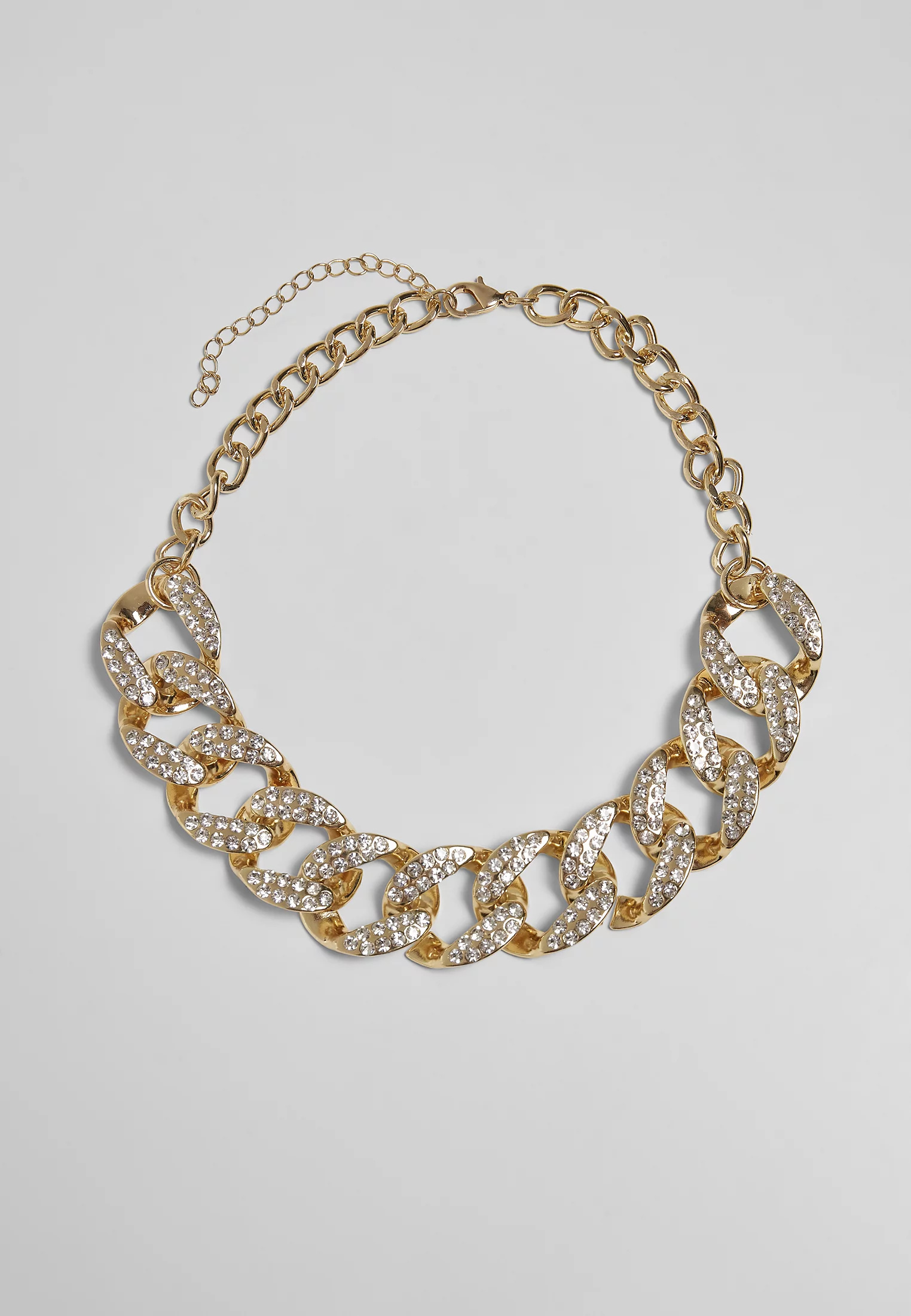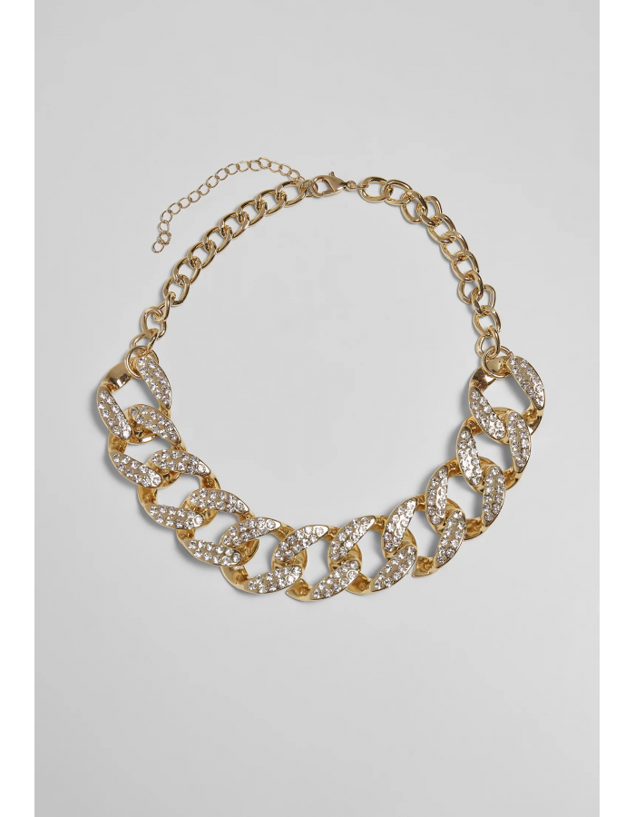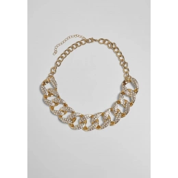 Krátký náhrdelník Urban Classics s velkými články řetízku je autentický poutač a je navíc opatřen kamínky. Zadní část tvoří menší články řetězu, přičemž samotný řetěz je dlouhý 38 centimetrů a je navíc velikostně nastavitelný pomocí jemného prodlužovacího řetězu. Pevný šperk je vyroben ze slitiny zinku a železa.
