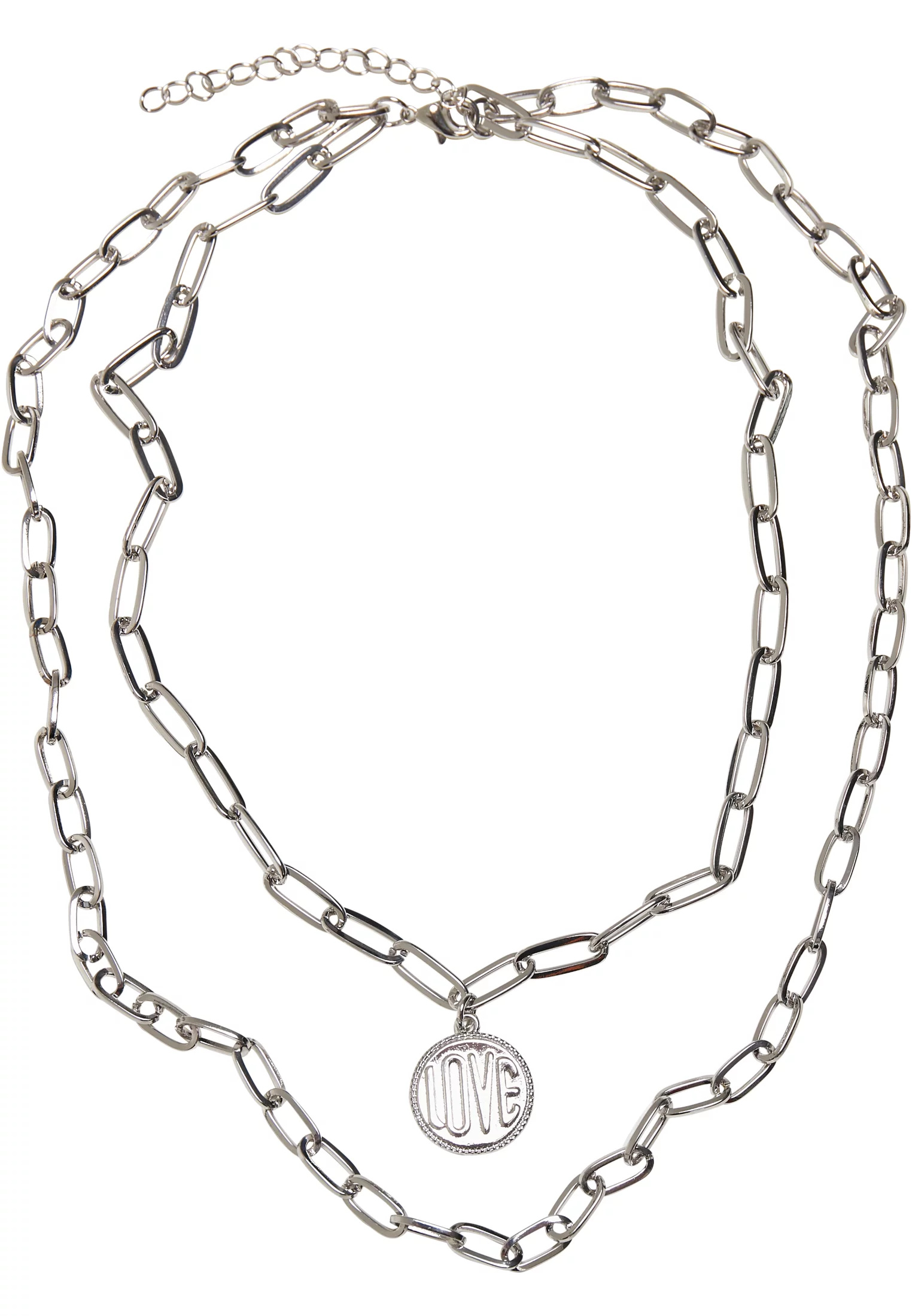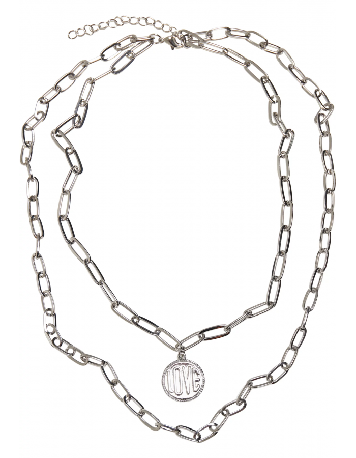 Tento dvouřadý náhrdelník s kotvicím řetízkem je módní šperk, který doplní každý městský outfit. Designovým vrcholem je kruhový amulet s nápisem "Love" vedle vnitřního řetízku. Náhrdelník Urban Classics je dlouhý 47 cm a poskytuje další 7 cm dlouhé prodloužení pro individuální nastavení velikosti a také jemné zapínání na humra. Náhrdelník padá středně vysoko a je vyroben ze železa.