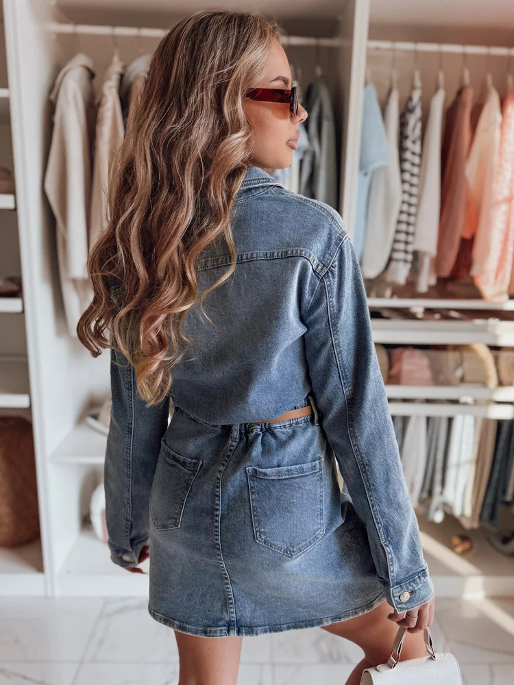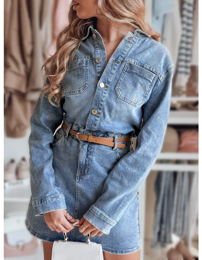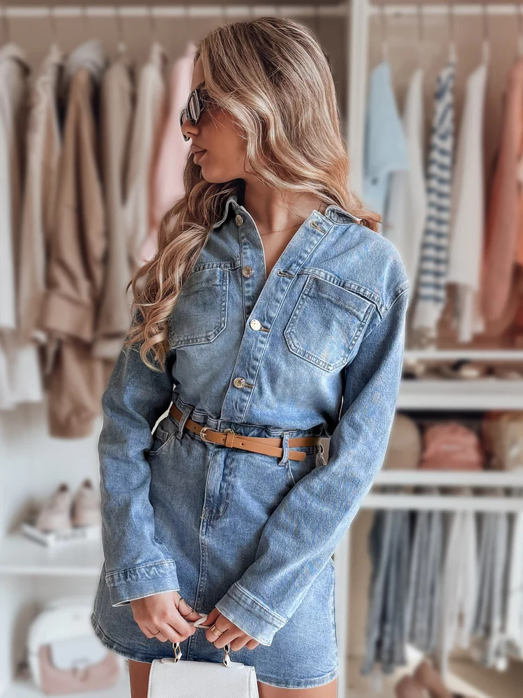 Sukienka damska o jeansowej strukturze, zaprojektowana z myślą o codziennym komforcie i spójnym wyglądzie. Fason z wyraźnie zaznaczoną talią porządkuje proporcje sylwetki. Długość mini sprawia, że całość prezentuje się lekko i nowocześnie. Model uzupełniono paskiem, który pozwala na regulację dopasowania.