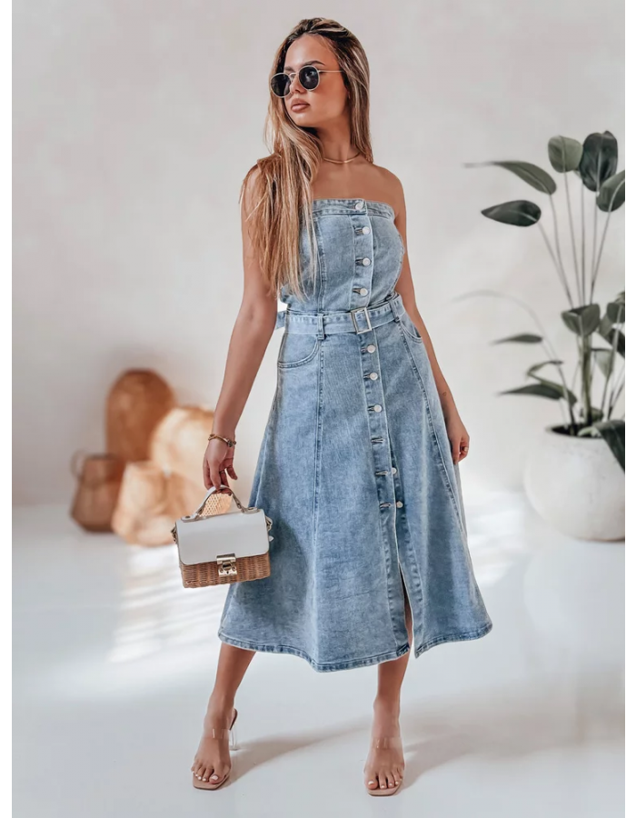 Sukienka o długości midi wyróżnia się kobiecym krojem i klasyczną formą inspirowaną denimem. Góra bez ramiączek podkreśla linię ramion i dekoltu, a rozkloszowany dół zapewnia swobodę ruchów. Zapięcie na guziki na całej długości nadaje jej uporządkowany charakter. Pasek w talii pozwala lepiej dopasować ją do sylwetki.