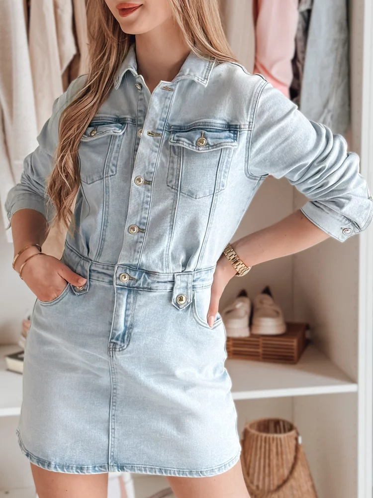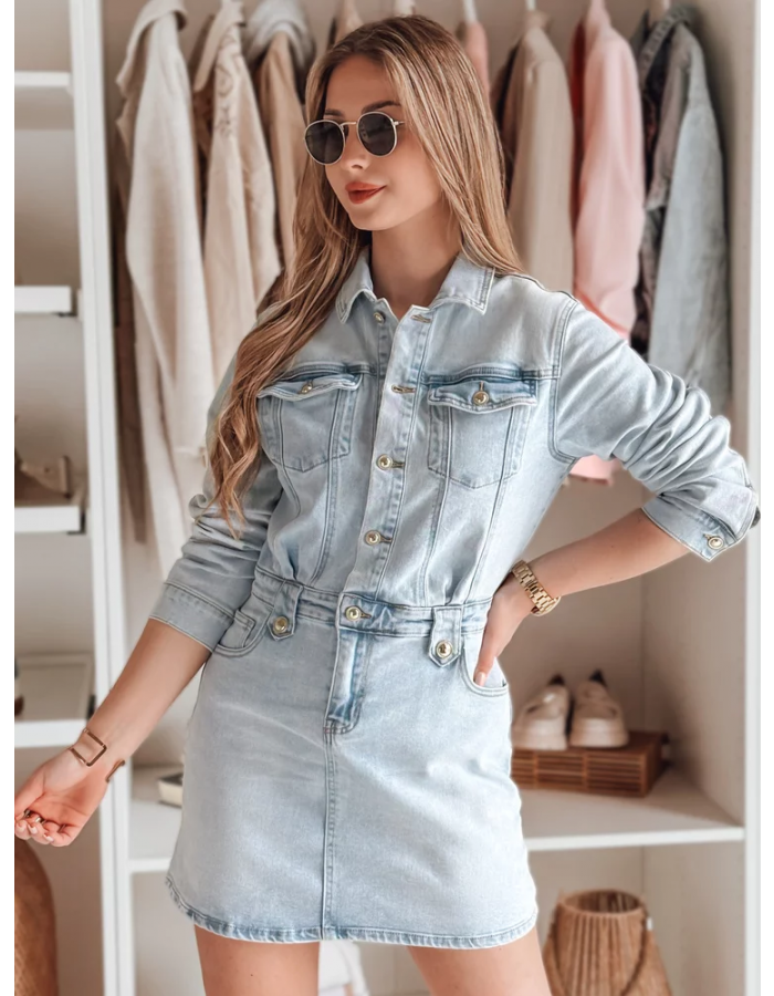 Jeansowa sukienka mini, która podkreśli kobiecą sylwetkę i doda casualowego szyku. Guziki na całej długości pozwalają na swobodną regulację dekoltu. Model posiada klasyczne kieszenie. Regulowane mankiety pozwalają na dopasowanie rękawów do własnych preferencji. Szlufki w talii umożliwiają dodanie paska dla dodatkowego akcentu. Idealna do casualowych looków, w ciepłe wiosenne dni.