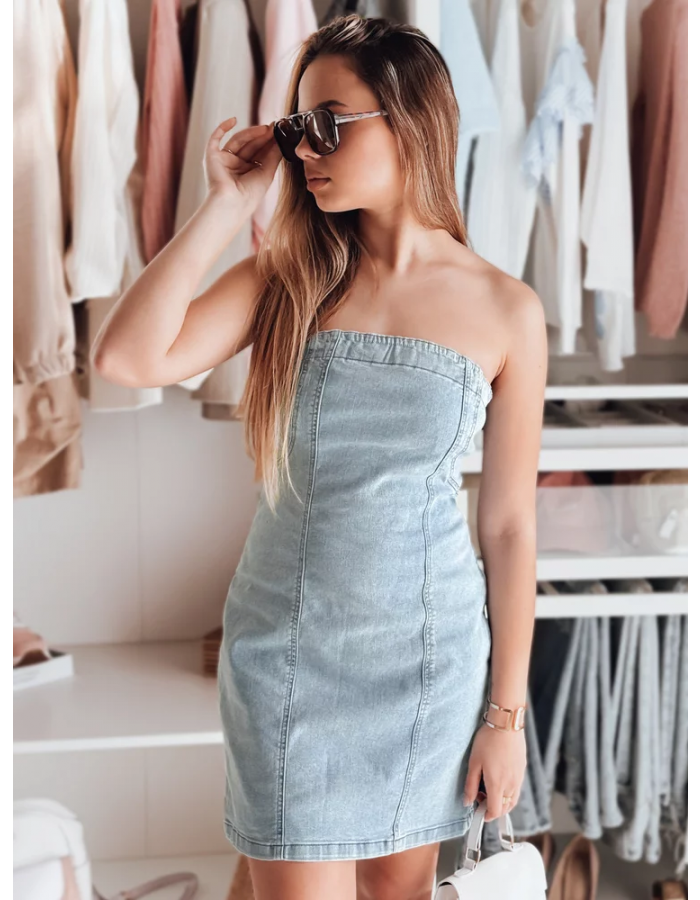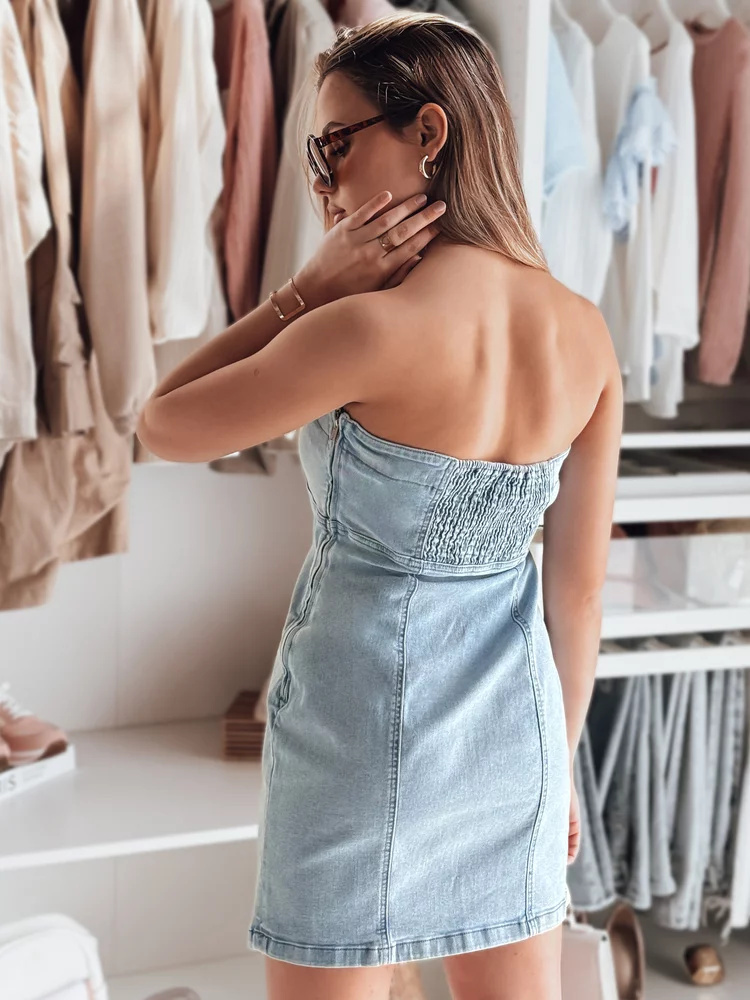 Sukienka jeansowa mini w fasonie tuby to idealny wybór do kobiet, które chcą podkreślić swoje kształty. Dopasowany krój i elastyczna wstawka na plecach zapewniają komfort noszenia. Zapięcie na zamek boczny sprawia, że sukienka leży idealnie. To świetna baza do casualowych stylizacji na ciepłe wiosenne oraz letnie dni. Doskonale komponuje się z marynarką lub kurtką jeansową.